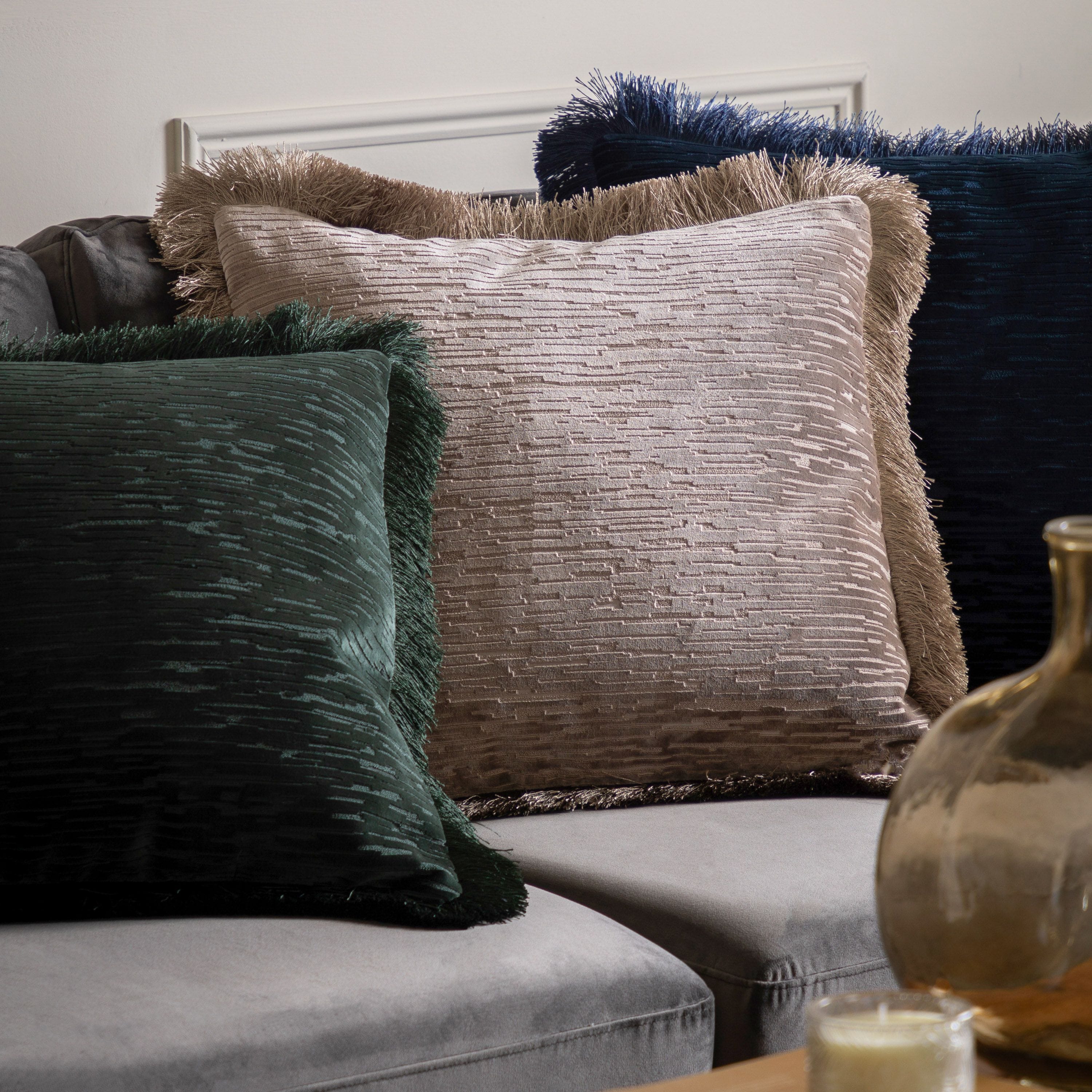 A luxurious textured velvet cushion in a beautifully rich tone, with soft fringed trim.
