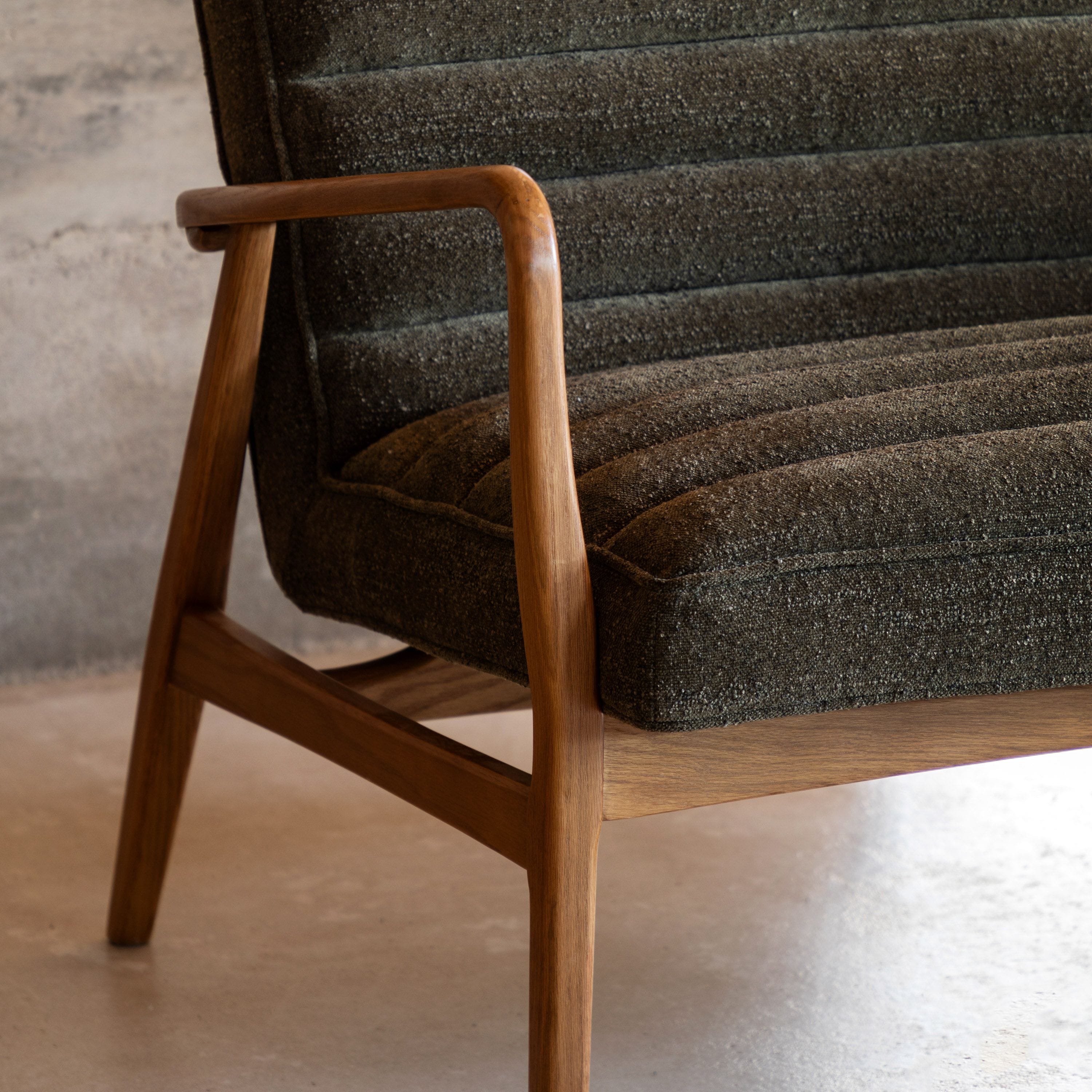 Introducing the Datzun 2 Seater Green Boucle, a stylish mid-century sofa that will elevate any living space. Made with top grade leather in Antique Ebony, this sofa features natural textures and grains, along with decorative horizontal channel stitching. The solid oak angled frame adds a touch of elegance to the design.