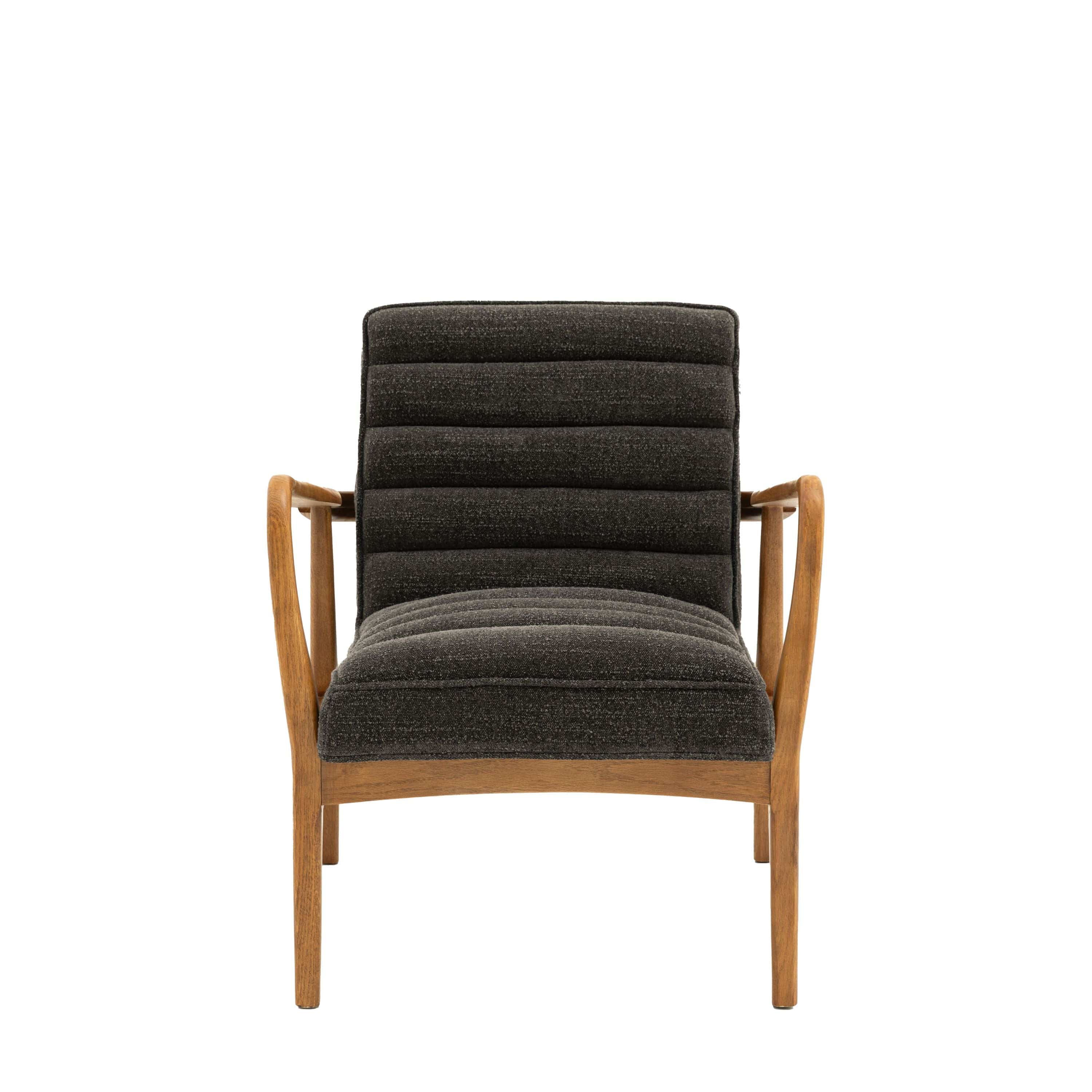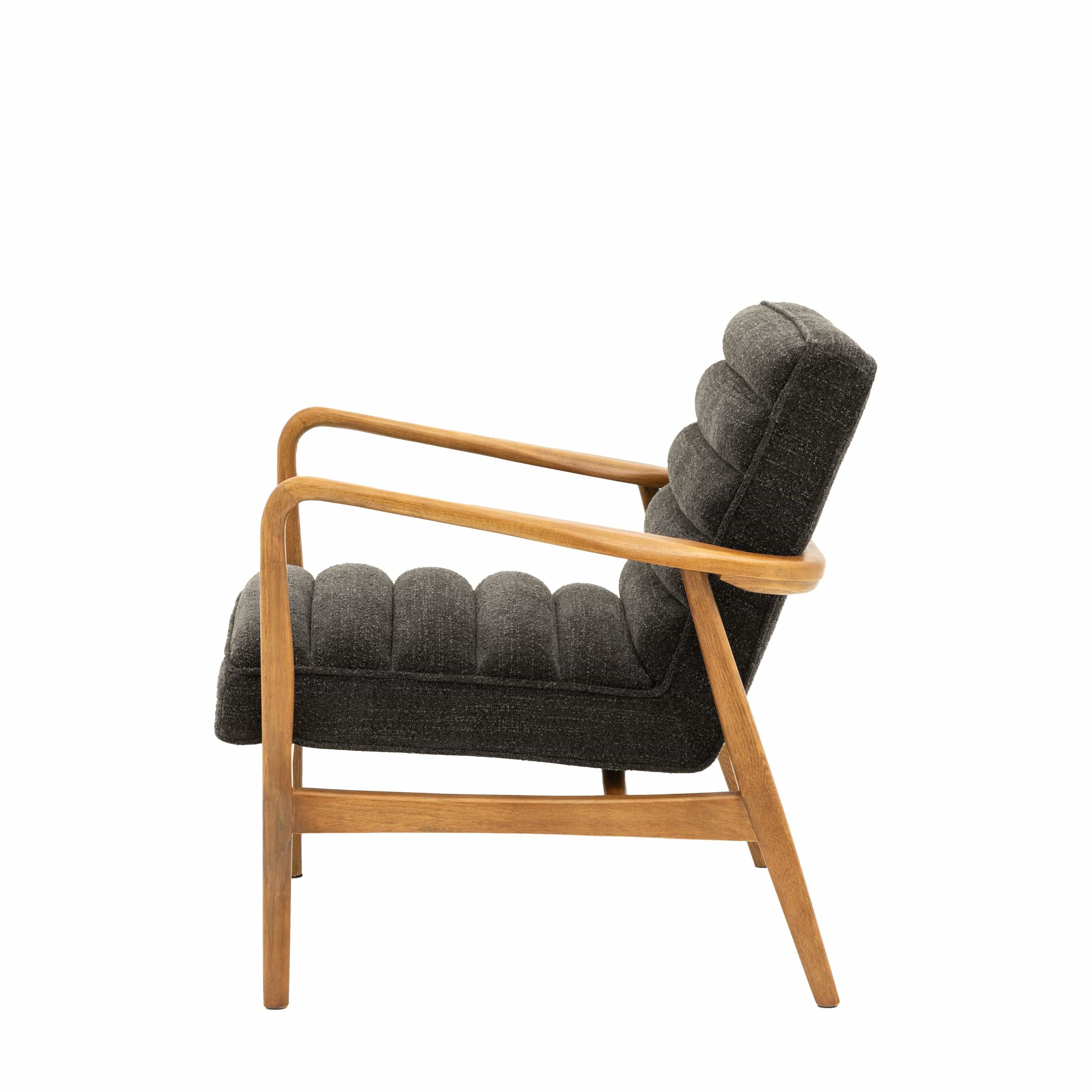 Introducing the Datzun Armchair Charcoal Boucle, a stylish addition to any home with its mid-century design and top grain leather in an antique ebony finish. The natural textures and grains add a touch of elegance, while the decorative channel stitching and solid oak angled frame provide both comfort and durability.