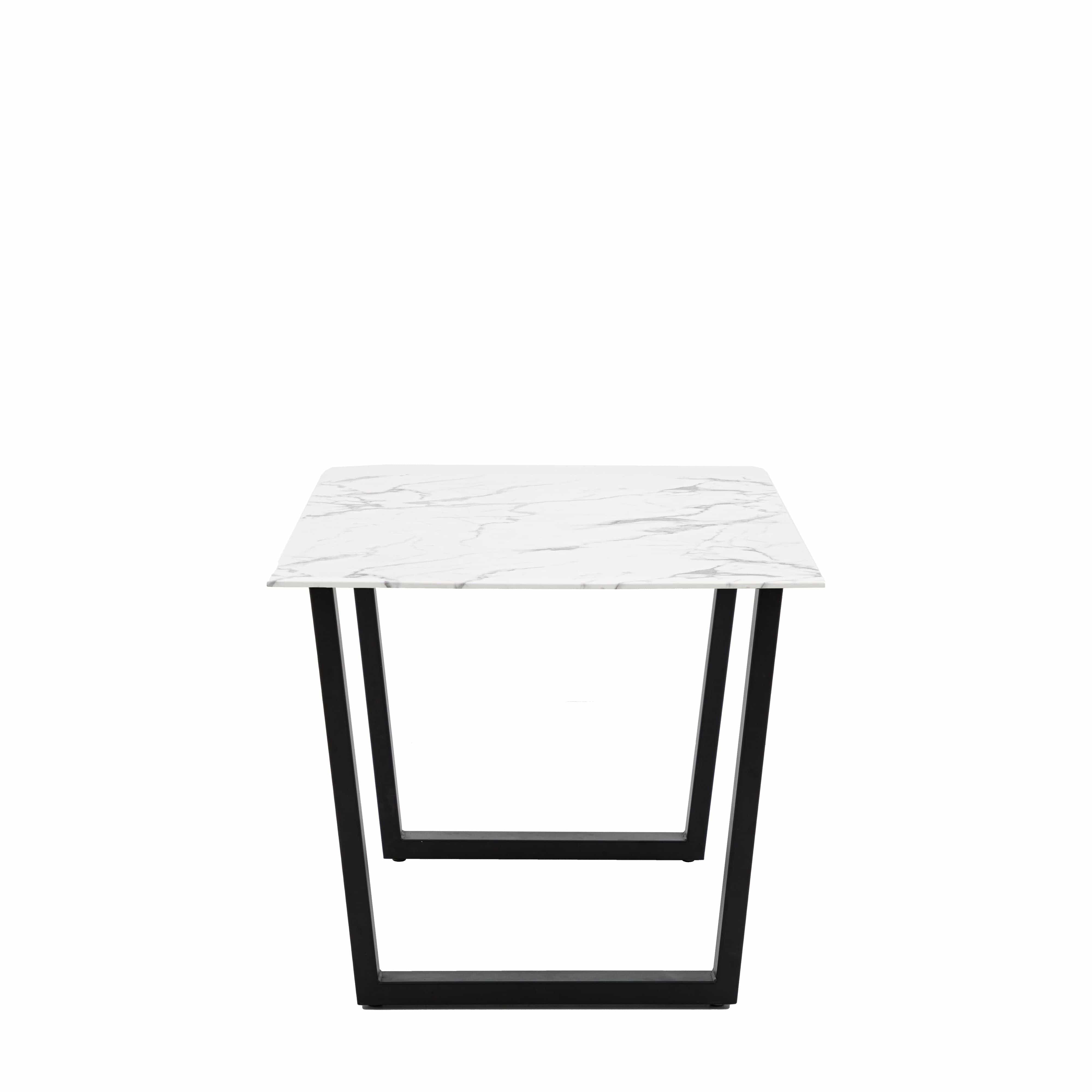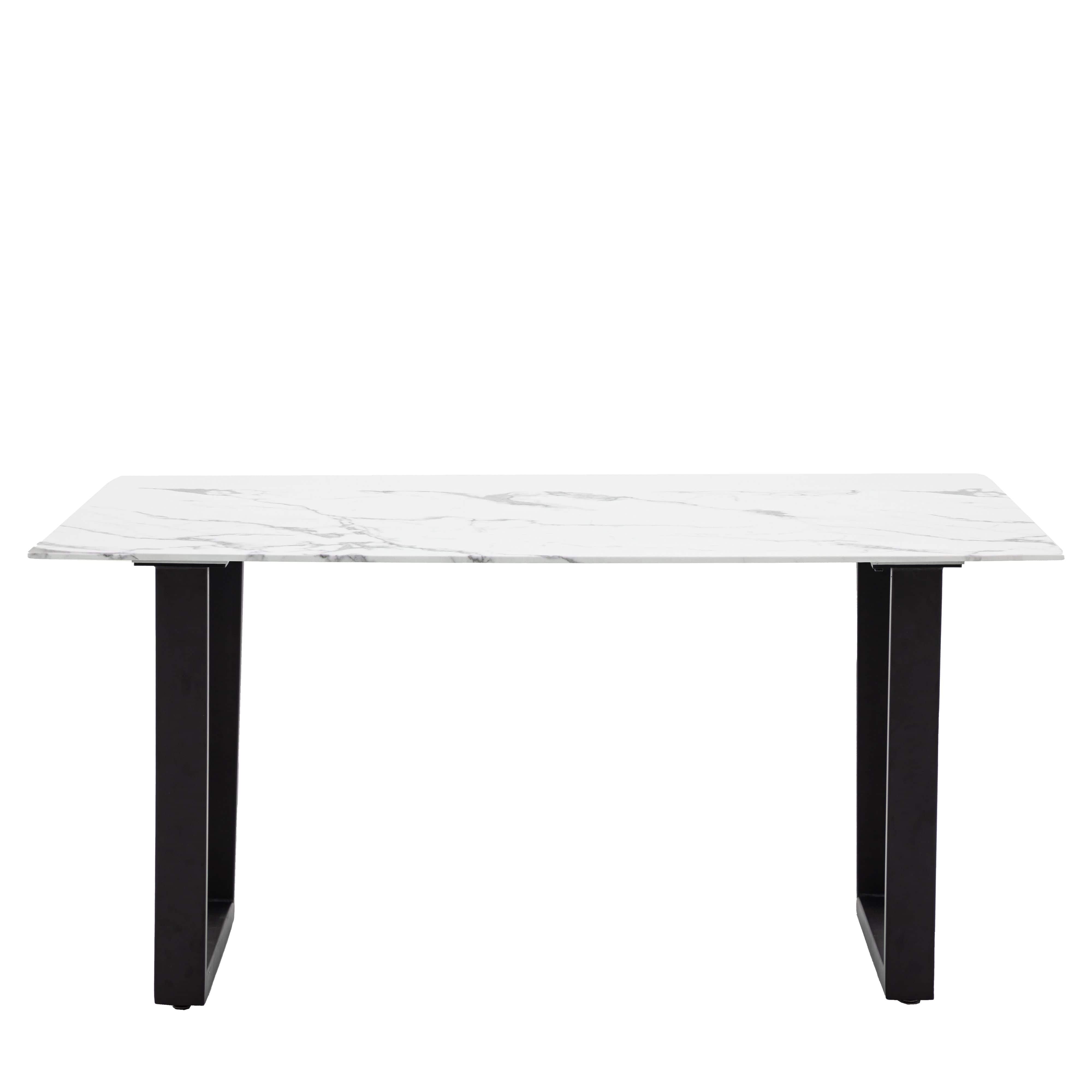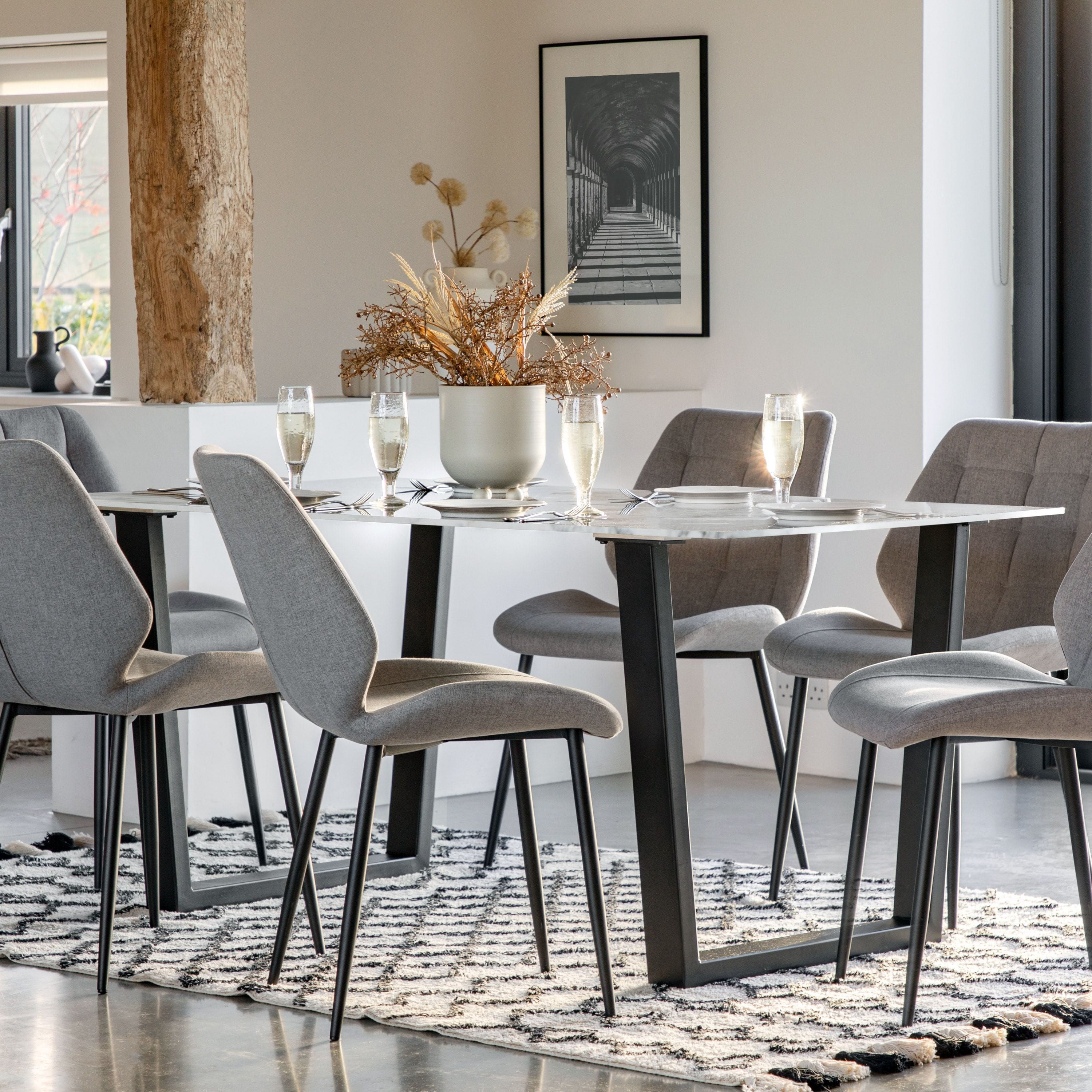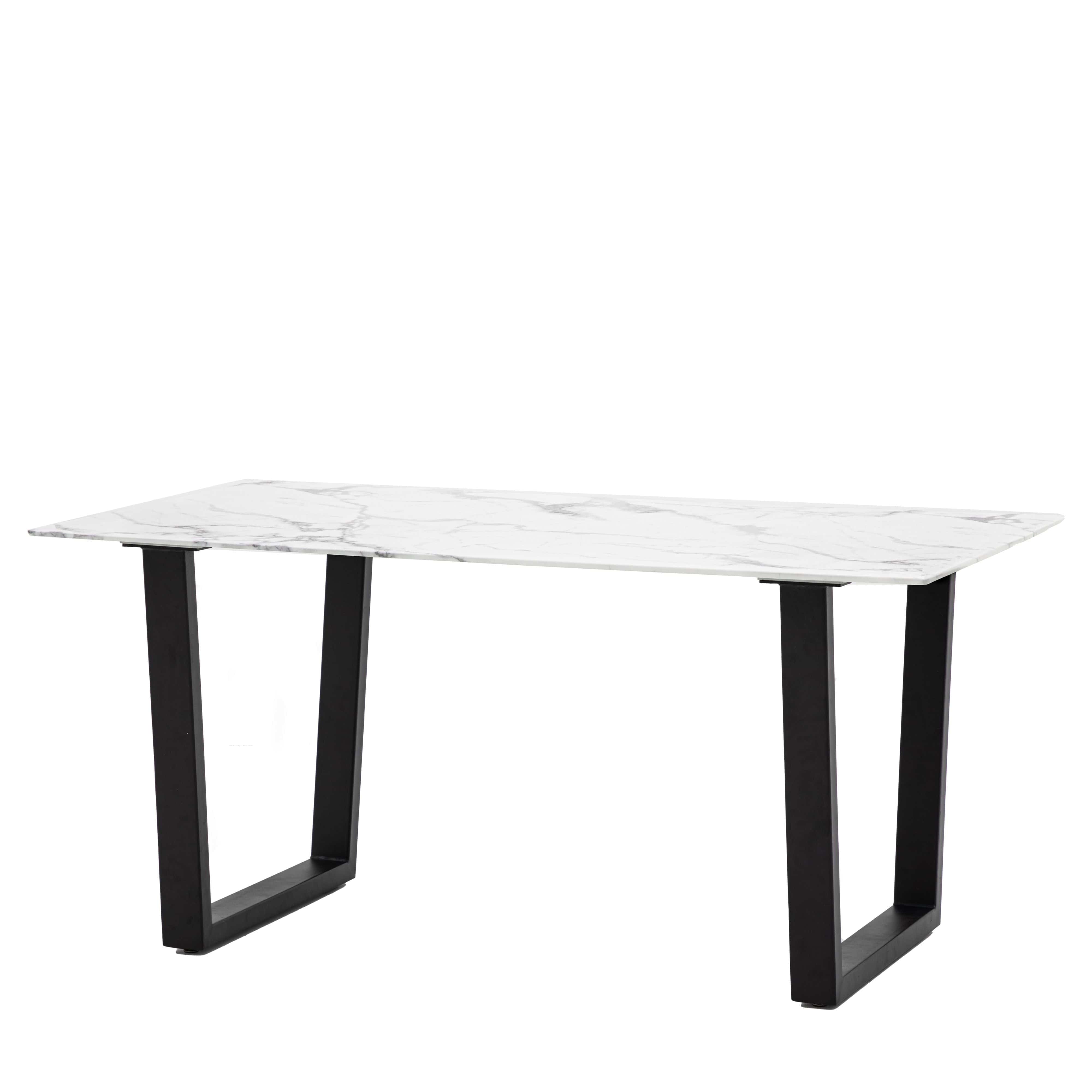 Stunningly modern and sophisticated, this table features a classic faux white marble glass top and distinctive angled black legs, creating a contemporary and stylish table you won't be able to take your eyes off. Perfect for bringing a modern touch to any dining space, the table seats 6.