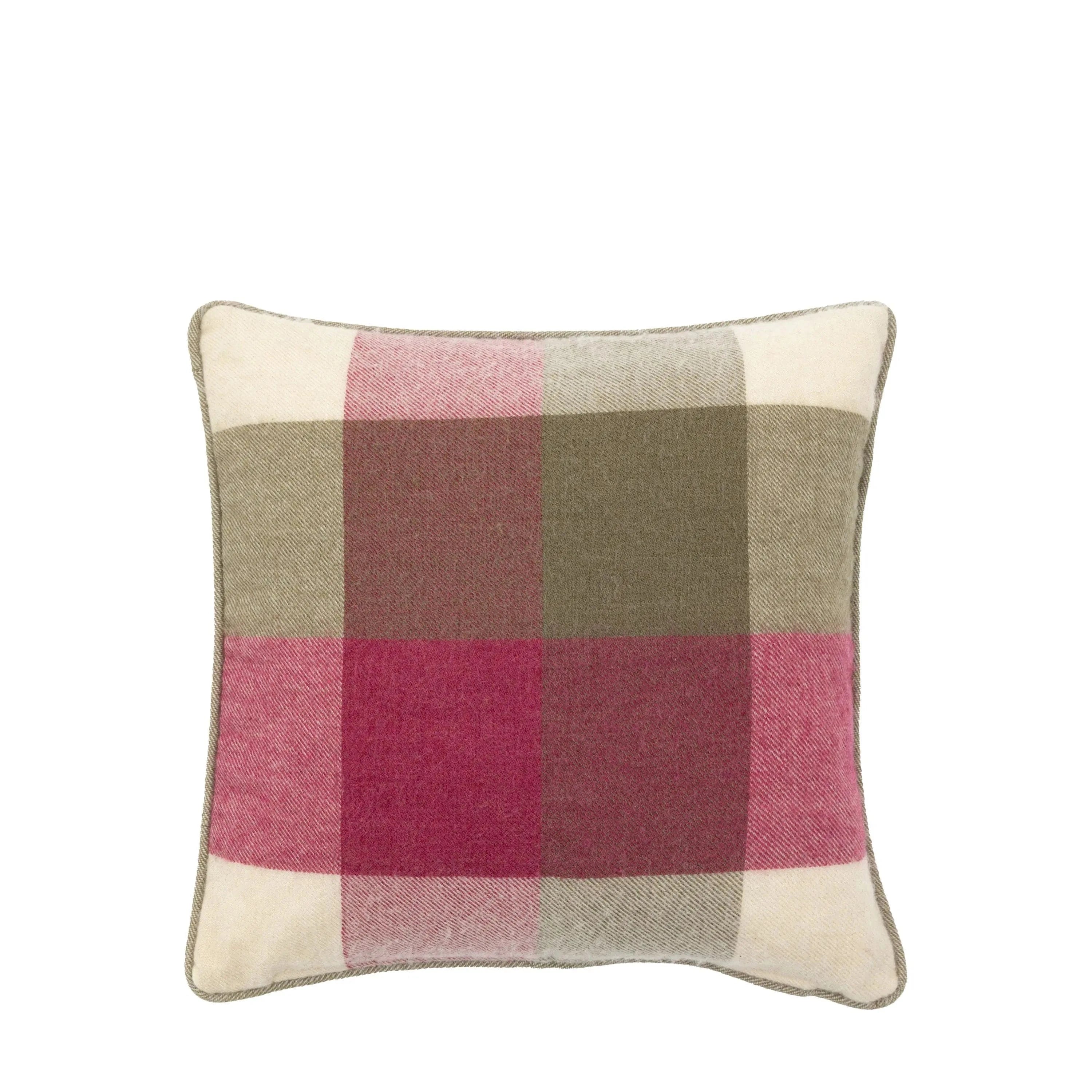 Introducing the Dursley Check Cushion Cranberry and Olive, the perfect addition to your home decor. This warm and cosy cushion features a beautiful checkered design in pink, green, and cream tones, adding a touch of country charm to any room.