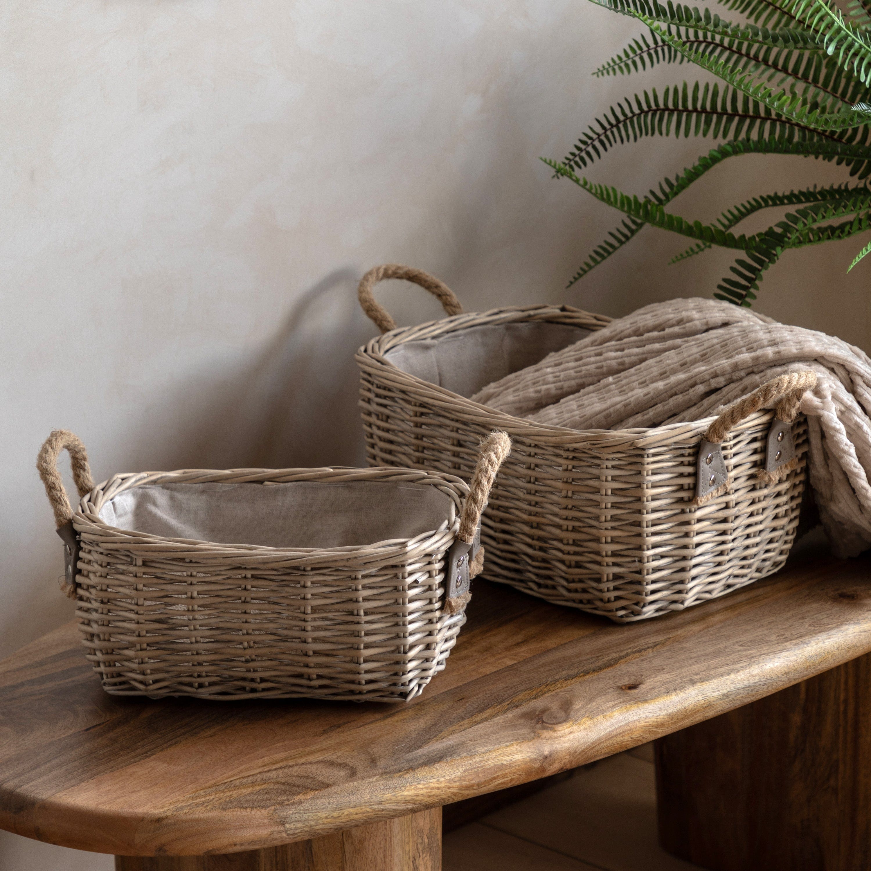 With rope handles for easy carrying, linen lining and natural woven material, this set of 2 oval baskets are great for storage throughout the home.