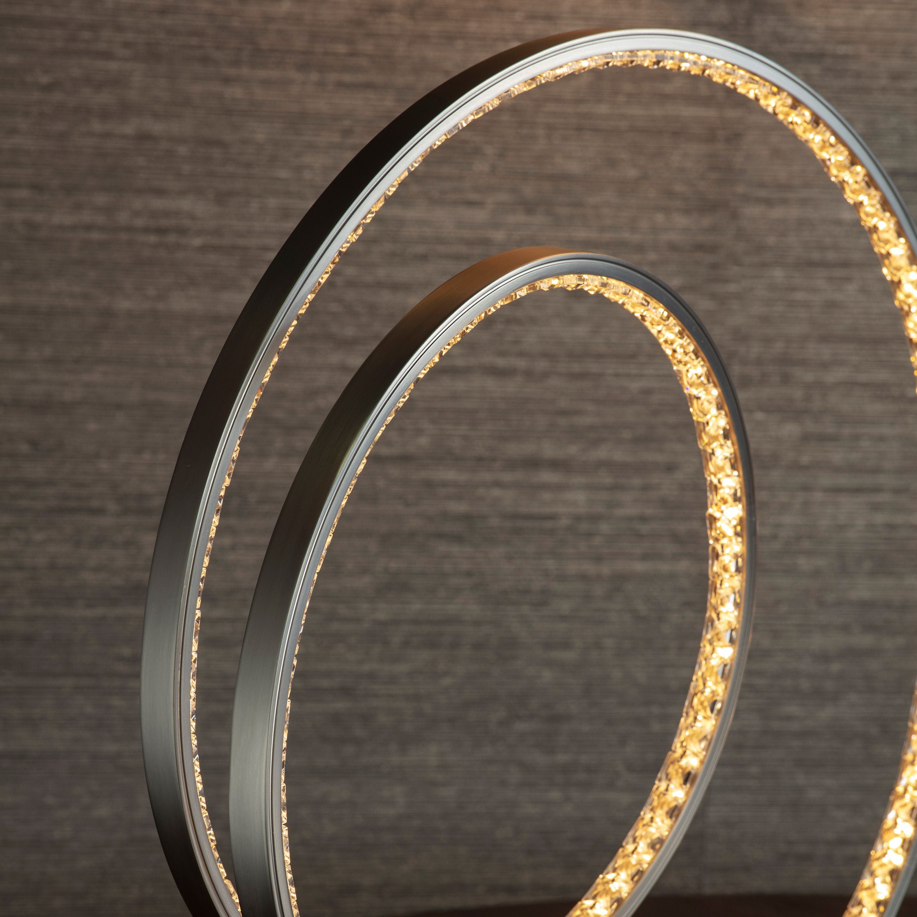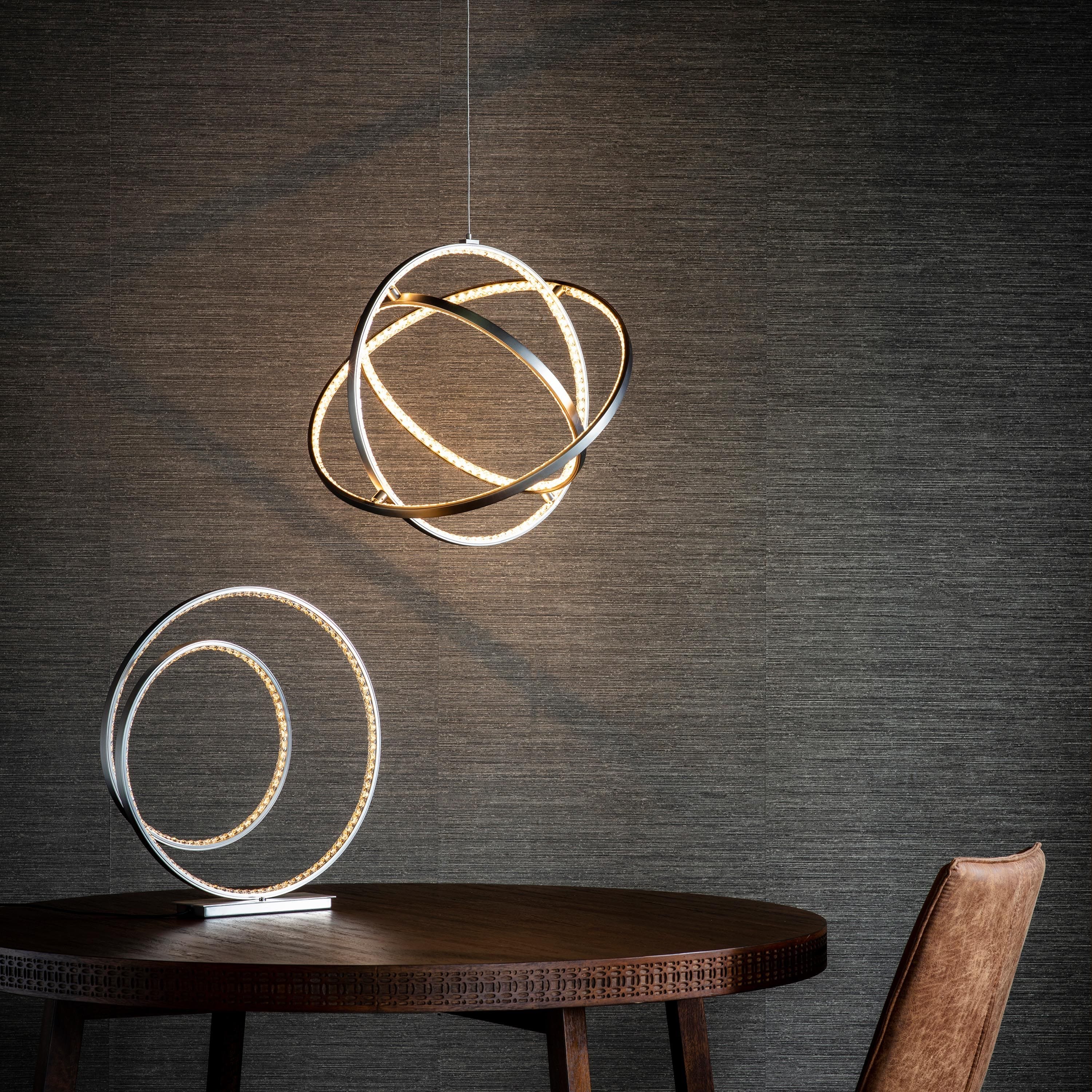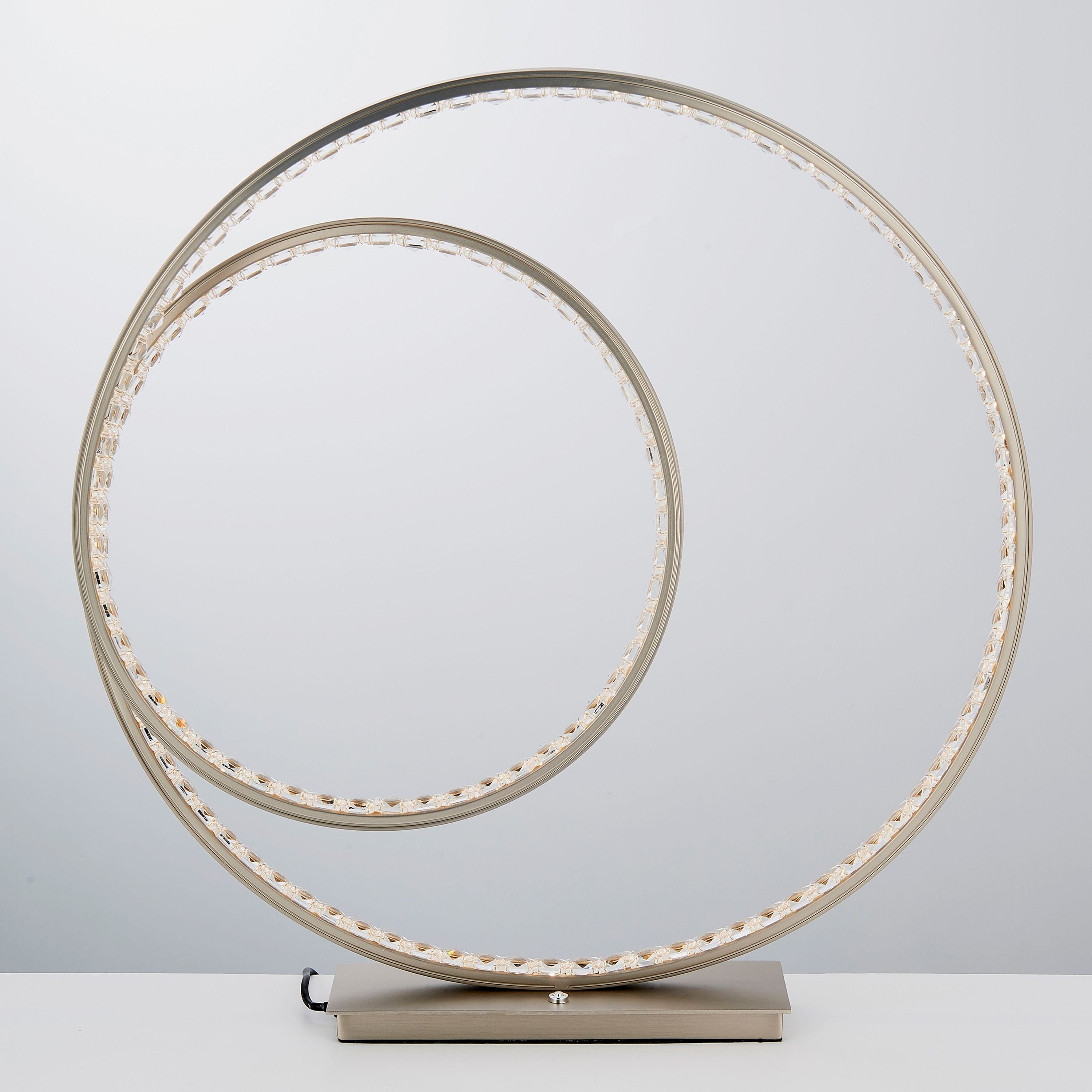 Contemporary LED ceiling pendant with a striking continuous loop of LED lights diffused through K5 crystals. Perfect for modern interiors and plated in a sophisticated matt nickel finish. Select 3 different light levels by touching an simple integrated chrome plated switch located on the base.