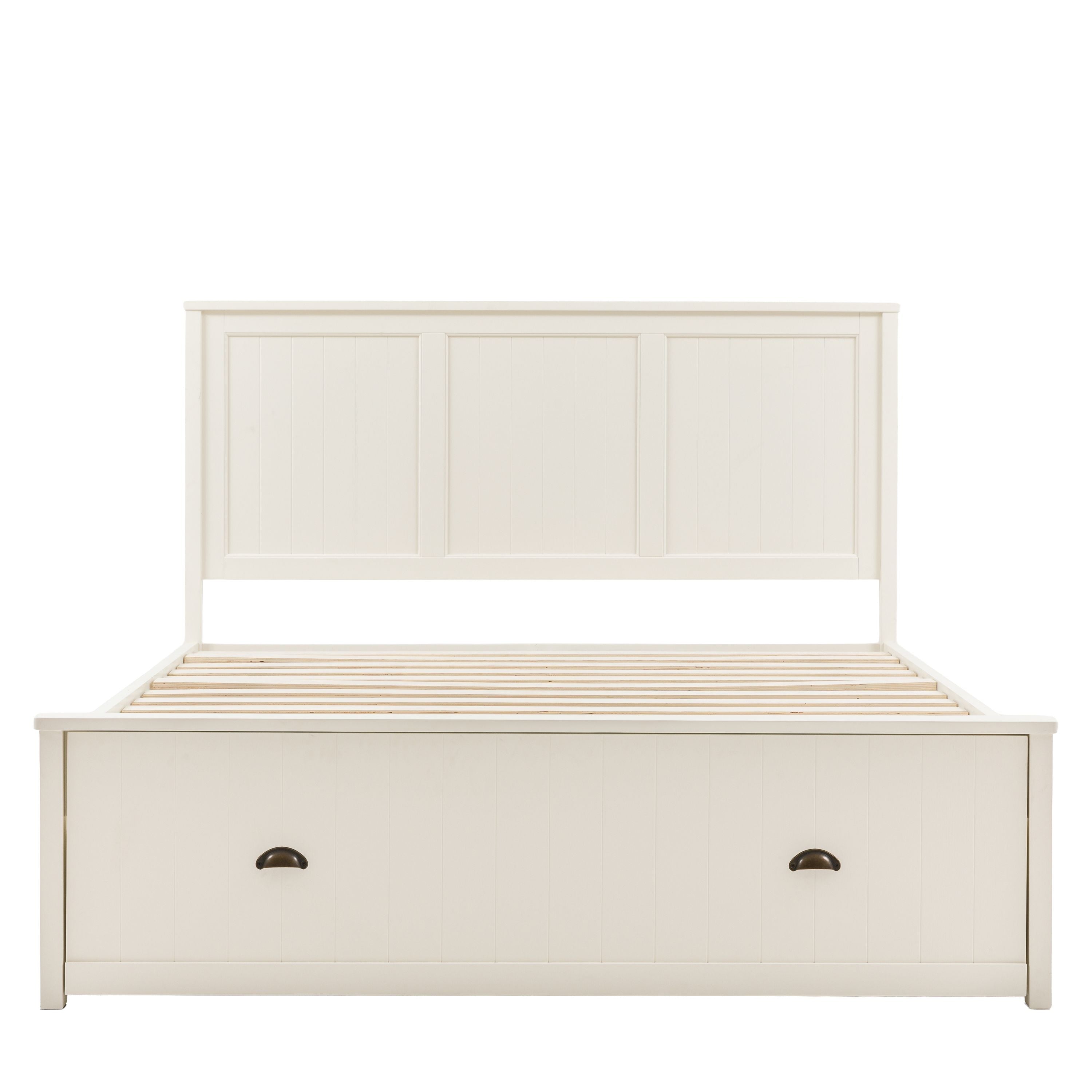 A charming and functional addition to any bedroom, this bed combines practical storage with traditional style features. With a soft white painted finish, metal handle details and a panelled headboard, the bedframe is full of homely charm. The added bonus of spacious storage drawers offers plenty of space for extra bedding, linens and more. Due to the handmade nature of this product, colour variations may be present.