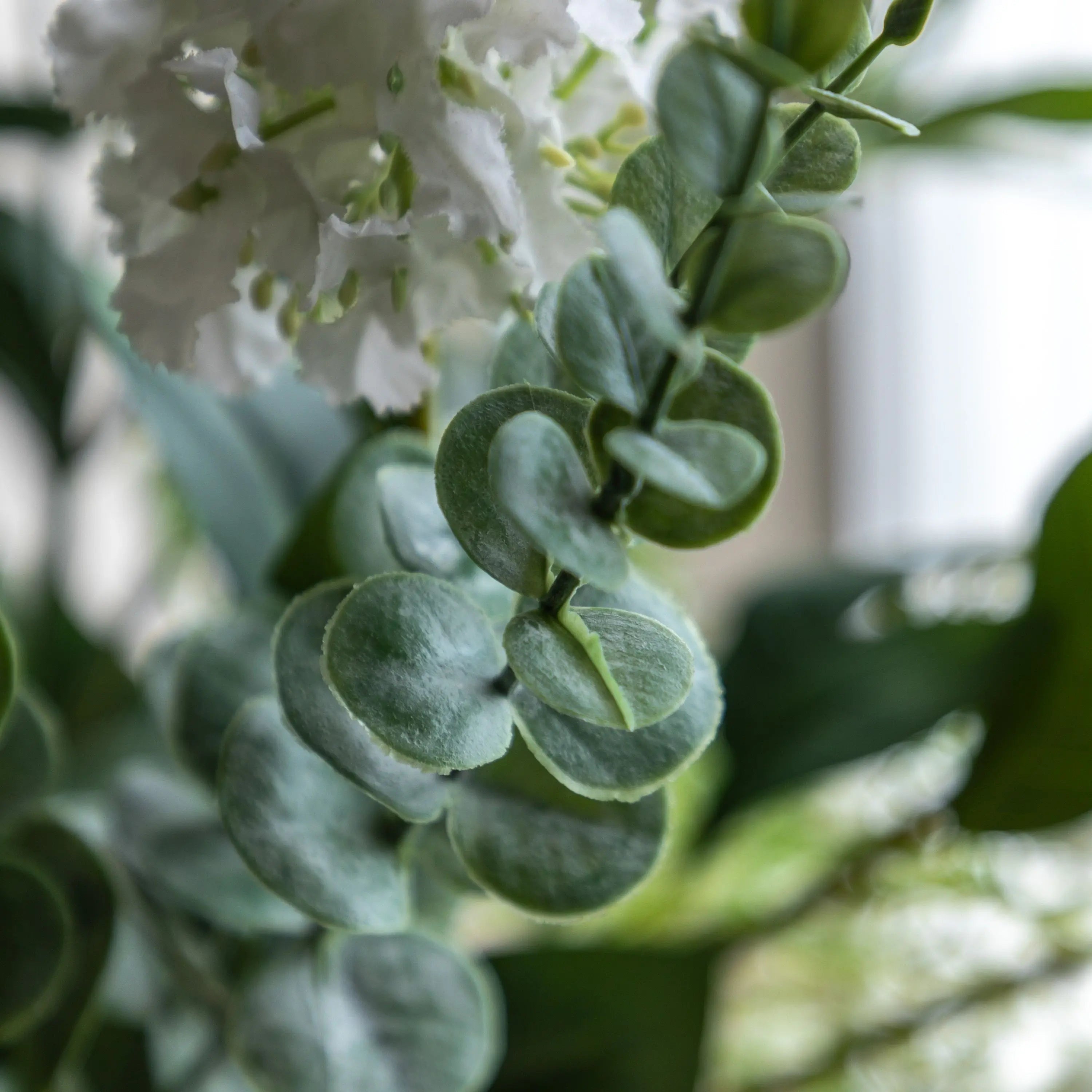 A beautiful full floral display that will never wilt or fade. Full of white hydrangea pom pom stems mixed with eucalyptus branches with a highly realistic feel, displayed in simple white vase.