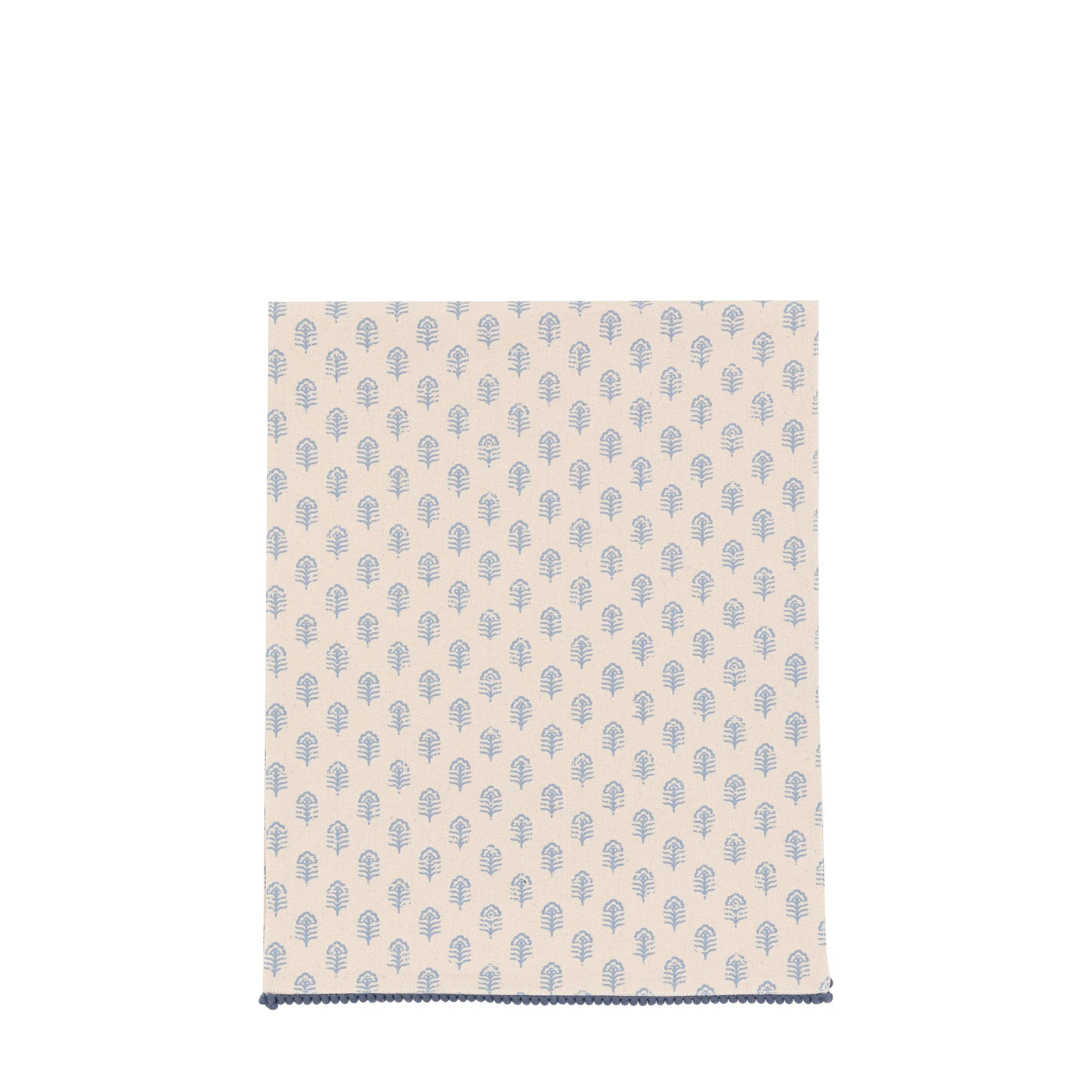 Add the finishing touch to a dining table with this charming table runner. featuring a blue floral stamped design and beautiful pom pom trim.