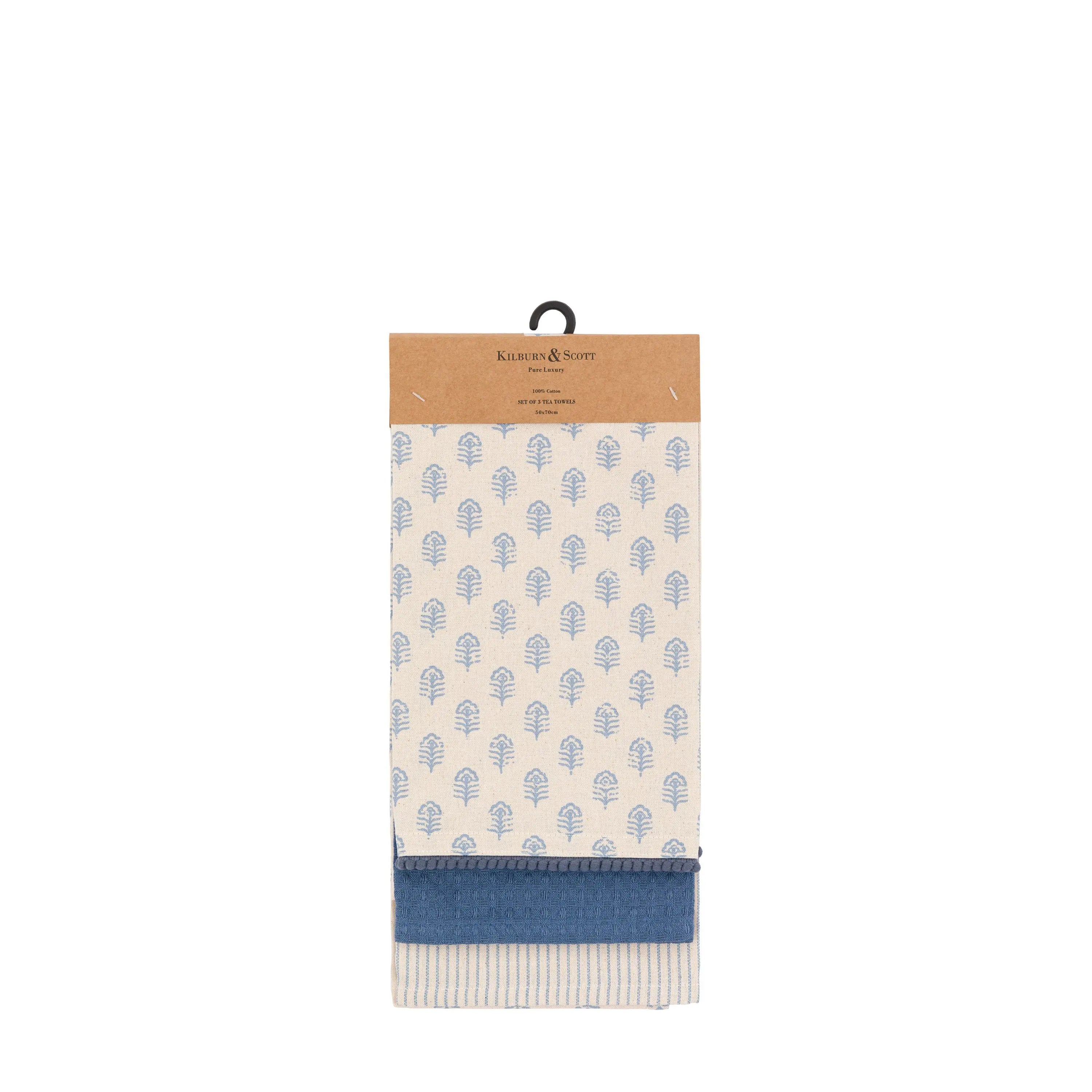 Fleur Floral Stamp Tea Towel Blue 3pk