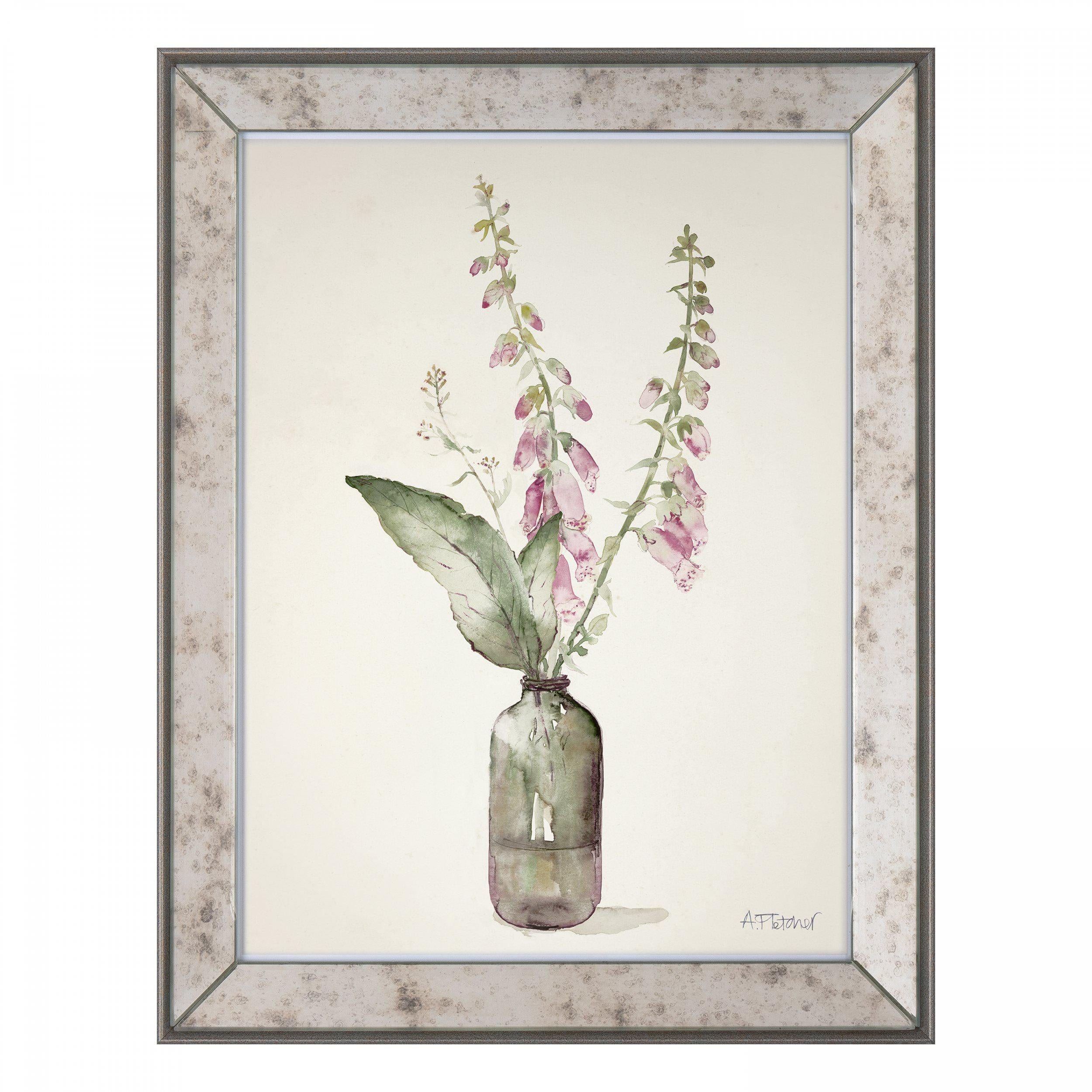 An exquisite watercolour illustration of a wildflower stem loosely arranged in an old glass bottle. Against a soft oatmeal background, Adelene Fletchers delicately illustrates the finer beauty in the spirited flower. The subtle, inviting colour palette adds a charming warmth to the artwork, enhancing its minimalistic composition. The overall rustic aesthetic is complemented with a mottled glass glaze, adding depth and texture to the design. An antique effect mirror frame with a bevelled edge further enhances the vintage grace of the piece.