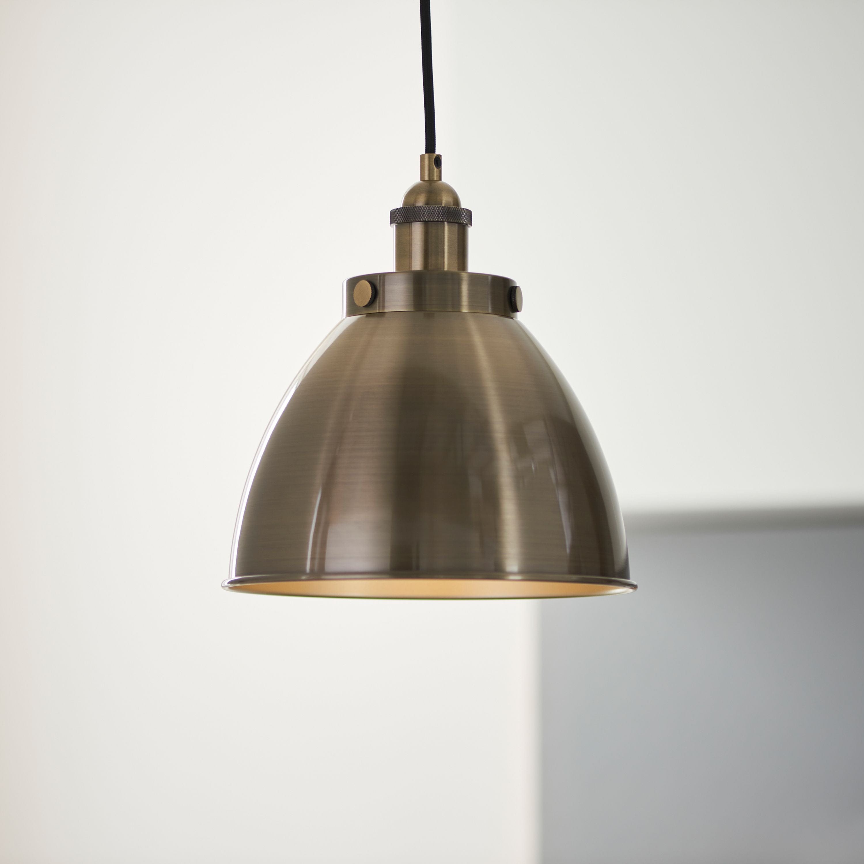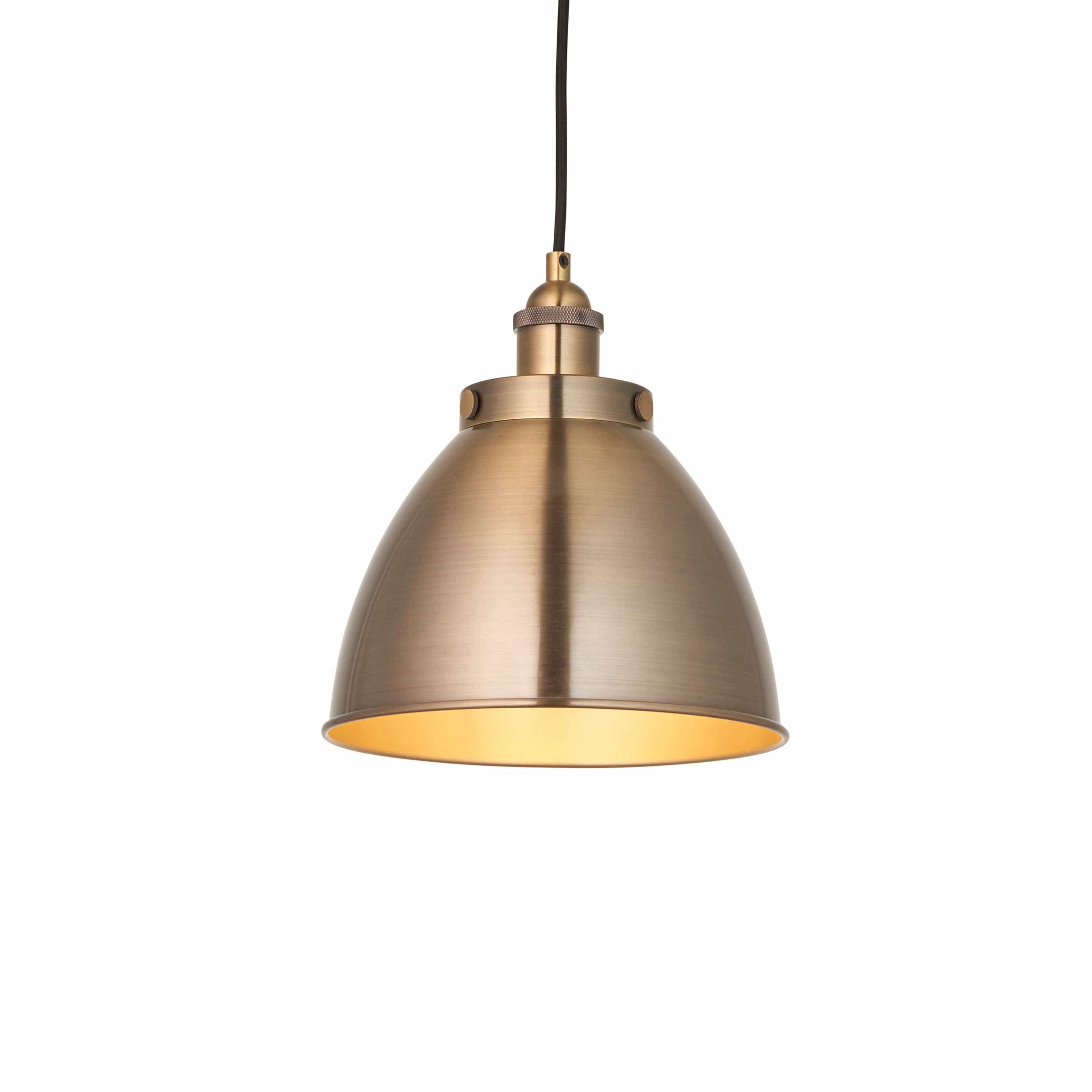 Introducing the Canada Pendant Light - Small Antique Brass, the perfect addition for today's stylish homes. This authentic 'resto' style industrial pendant is finished in antique brass plate, giving it a vintage and timeless look. The light is suspended from a height adjustable black fabric flex, allowing you to customize it to your desired length. Pair it with filament LED lamps for that perfect industrial style and create an on-trend bar or bistro look in your home.