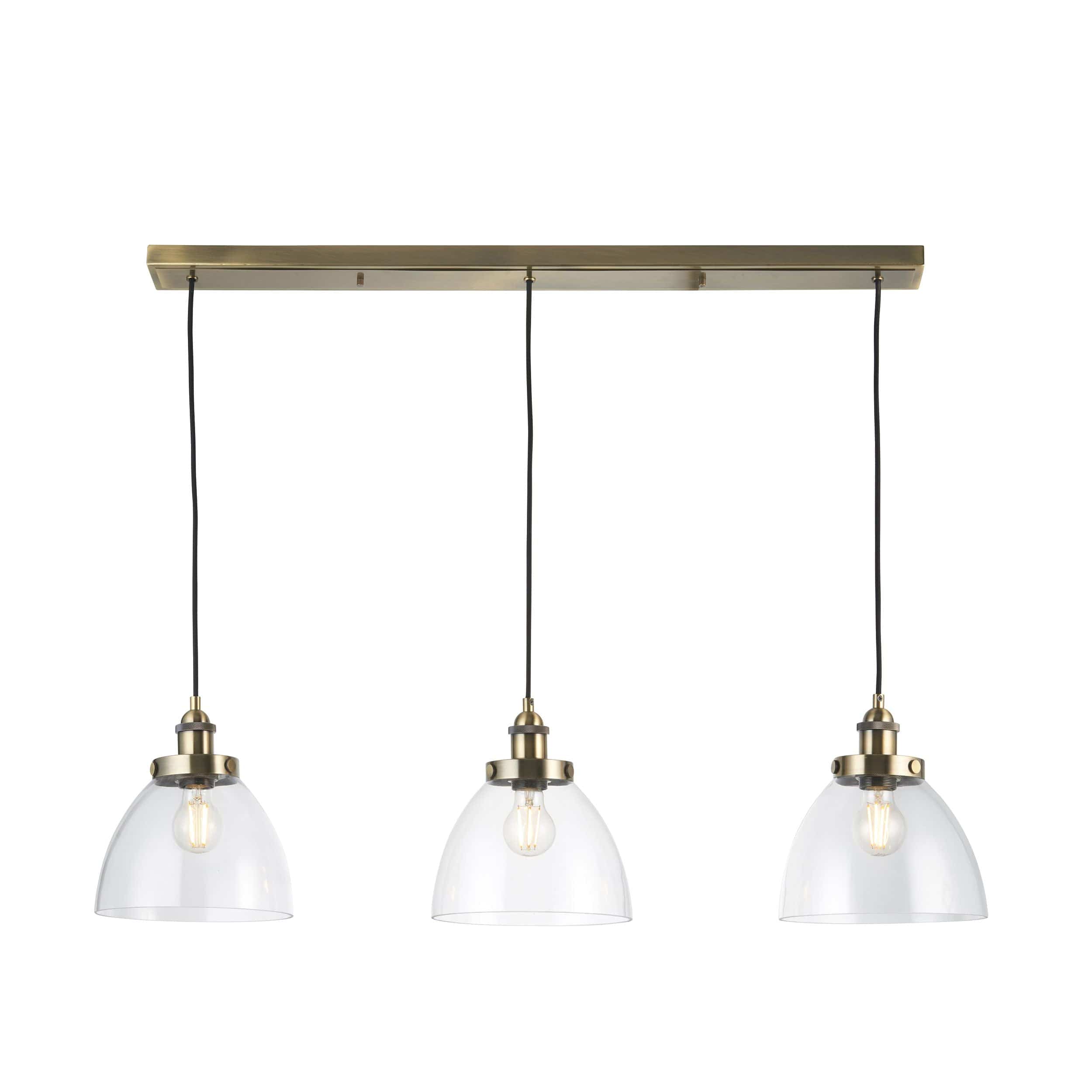 Introducing the Chadderton 3 Pendant Light Antique Brass, a must-have for any stylish home. This industrial-style light features a linear semi flush design with an antique brass finish and authentic knurled lamp holder details. The clear glass shades add a touch of elegance and pair perfectly with filament LED lamps. Whether placed above a breakfast bar or dining table, this light will create a trendy bar or bistro look in your home. Other family items are also available to complete the look.