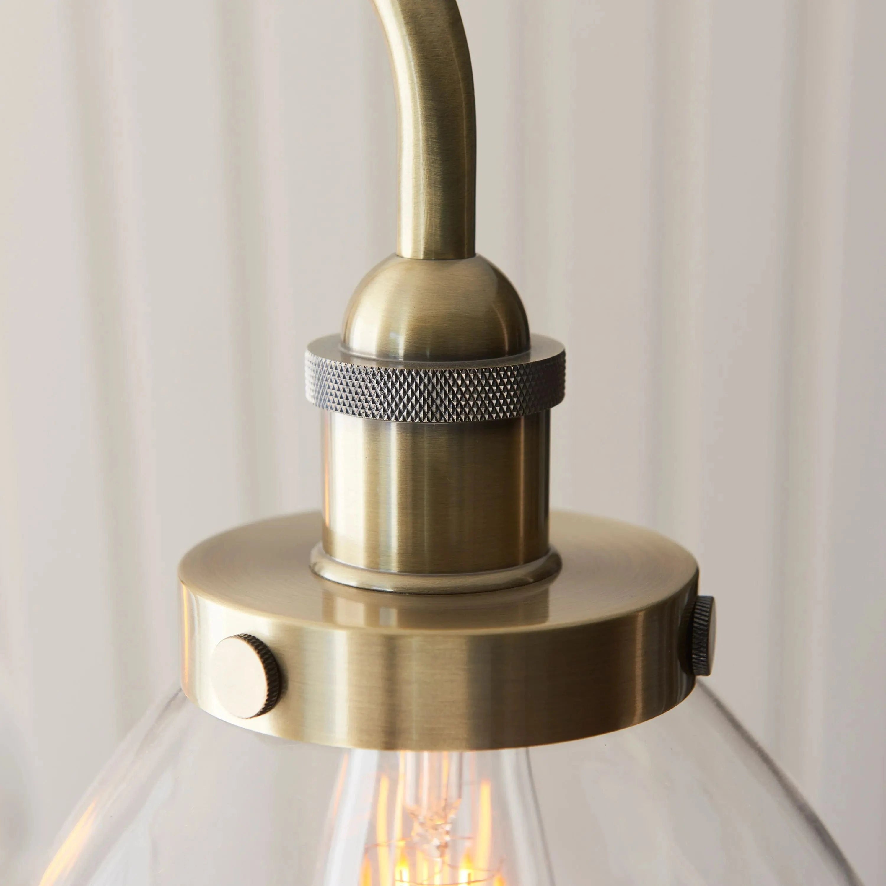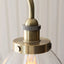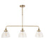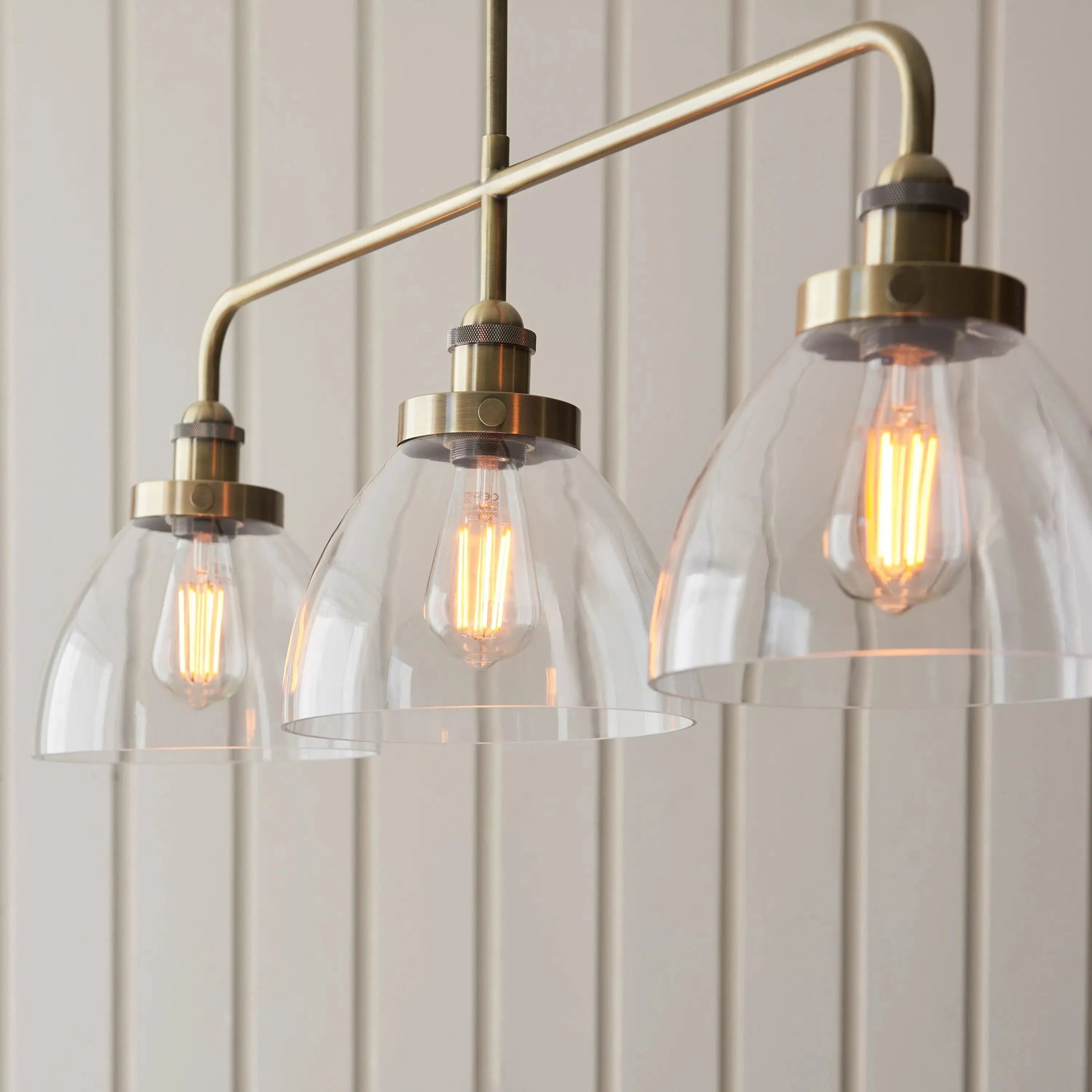 An ideal Industrial style linear pendant with adjustable height stem, great for dinning rooms and kitchens. Antique brass finished metalwork with knurled details and clear glass shades.