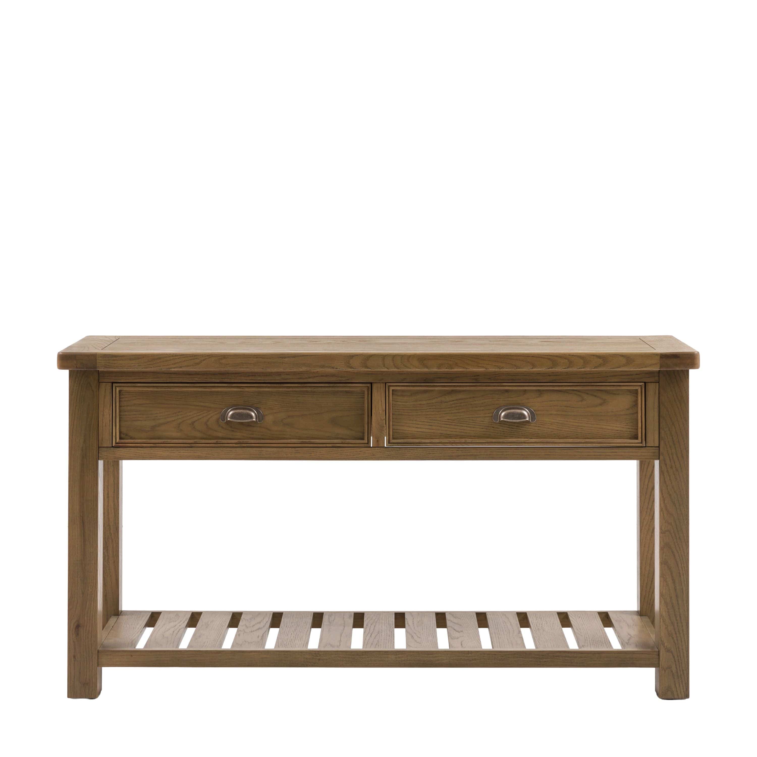 Add timeless charm to your home with this beautifully crafted console table. Featuring a spacious top, a large practical drawer with classic metal handles, and a slatted lower shelf, this console table offers ample storage and display opportunities, making it perfect for living spaces, hallways, kitchens and more The warm wood finish made from oak wood solids & veneers highlights natural grain, complementing the classical design and creating an inviting focal point for any home.