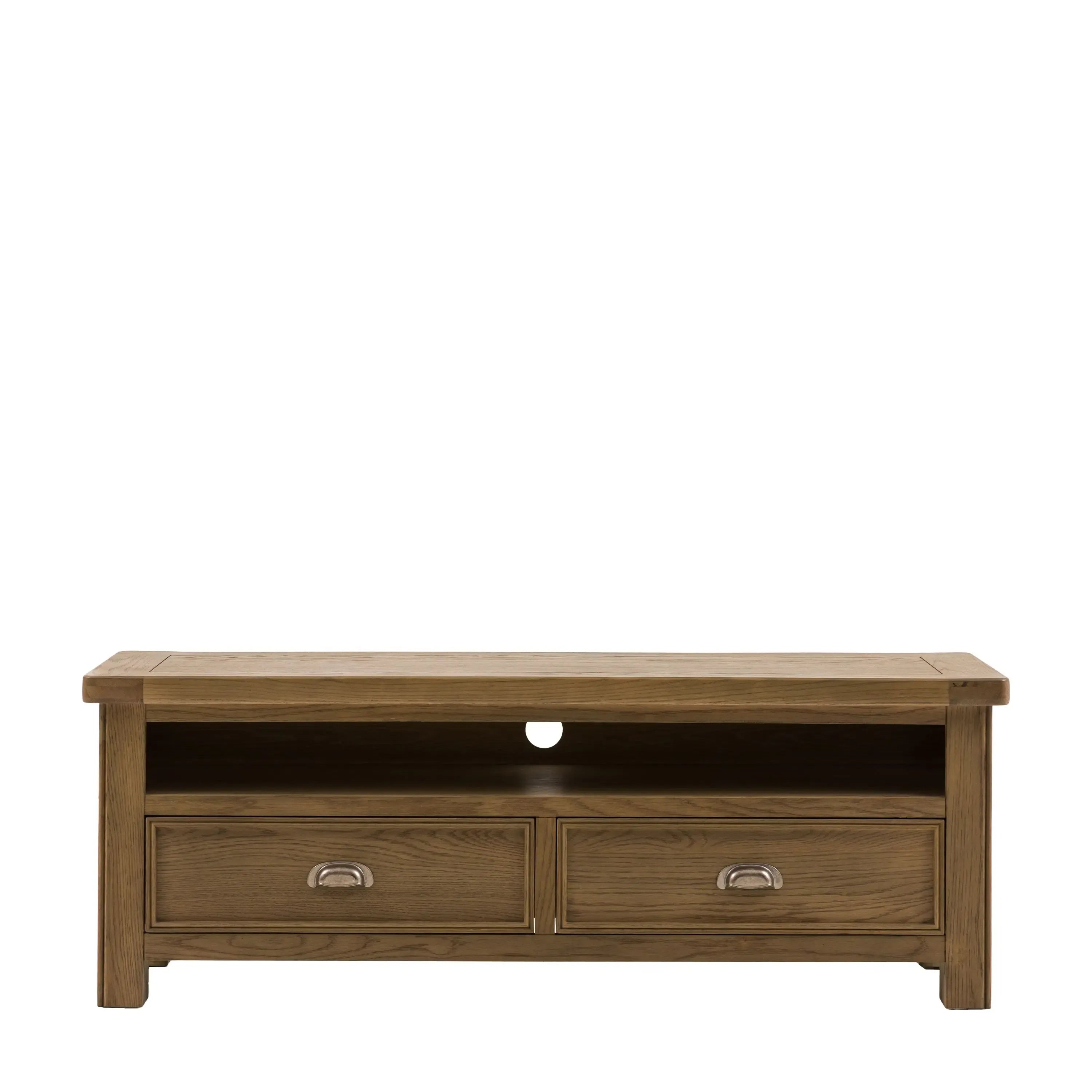 Organise your entertainment space with this charming media unit. Its sturdy design provides a stable base for your television and electronics, while the spacious open shelf offers easy access for devices and cables. Two convenient drawers conceal any clutter, finished off with a pair of chic metal handles, perfectly blending seamless functionality with a classic design. The solid oak & veneers with its rich grain detail will add warmth to a room, creating the perfect piece for a wide range of interior styles.