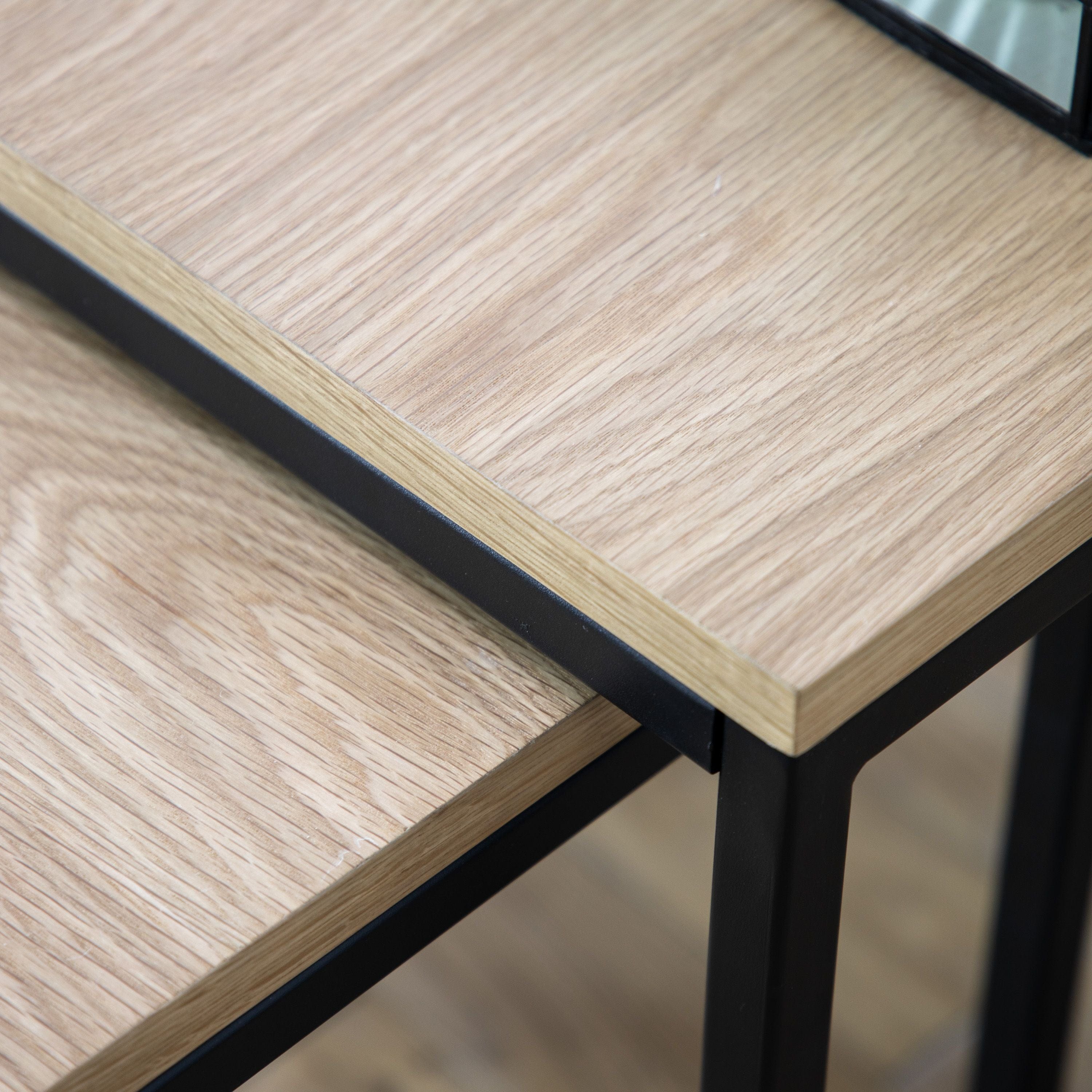 This stunning nest of tables combines clean sharp lines with natural oak veneer tops and matt black metal bases to offer crisp contemporary style. The smaller table fits under the larger one when not in use. It is part of a collection which offers a range of tables plus a display unit. The collection is part of our Packed-Flat Design Project, offering easy delivery to any room in any property, whilst reducing the packaging needed. Easy assembly is required, but all the tools needed are supplied.