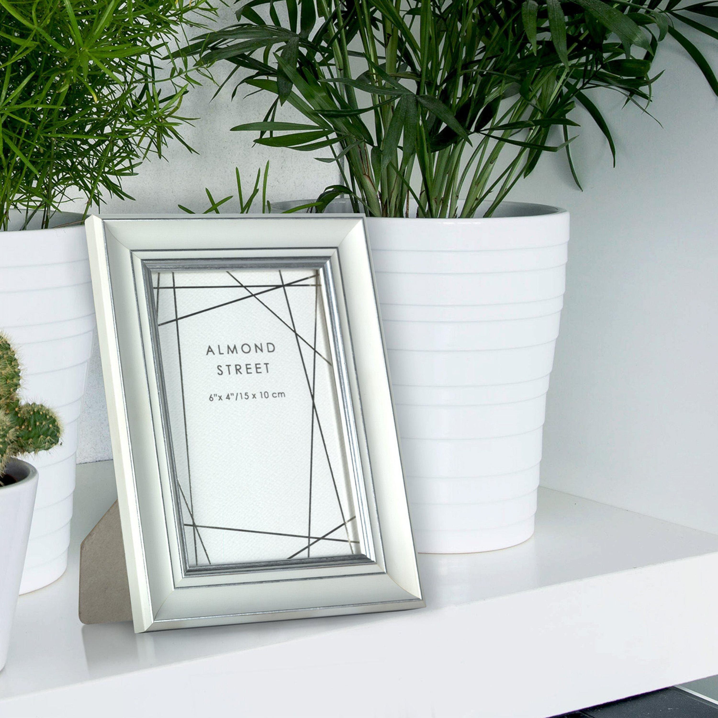 A simple pale grey matt frame is injected with life by the metallic highlights that pivot across the profile edges. A contemporary design with a traditional twist. A grey velvet window opening back completes the overall aesthetic. The versatile style is available in two additional sizes 6" x 4", and 7" x 5".