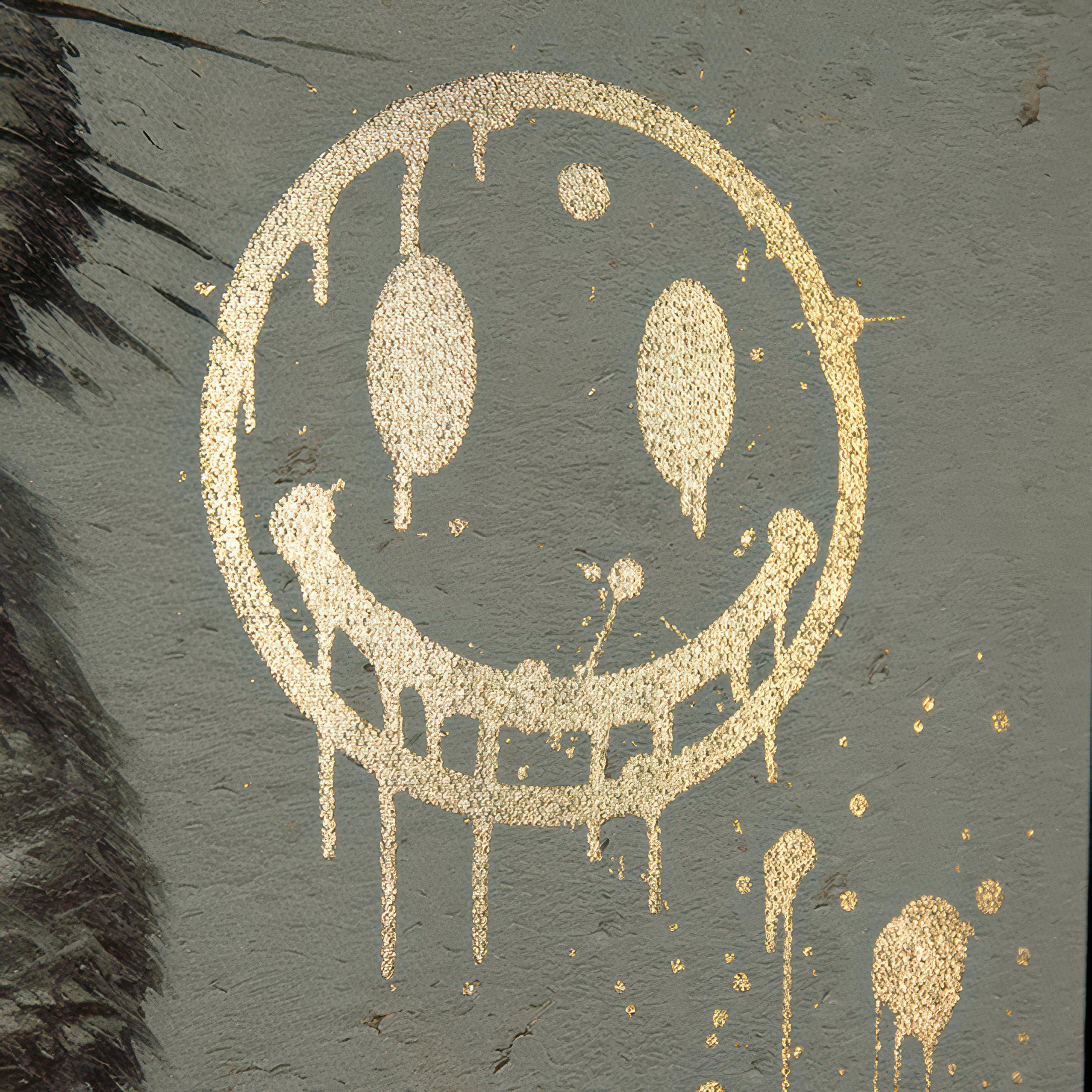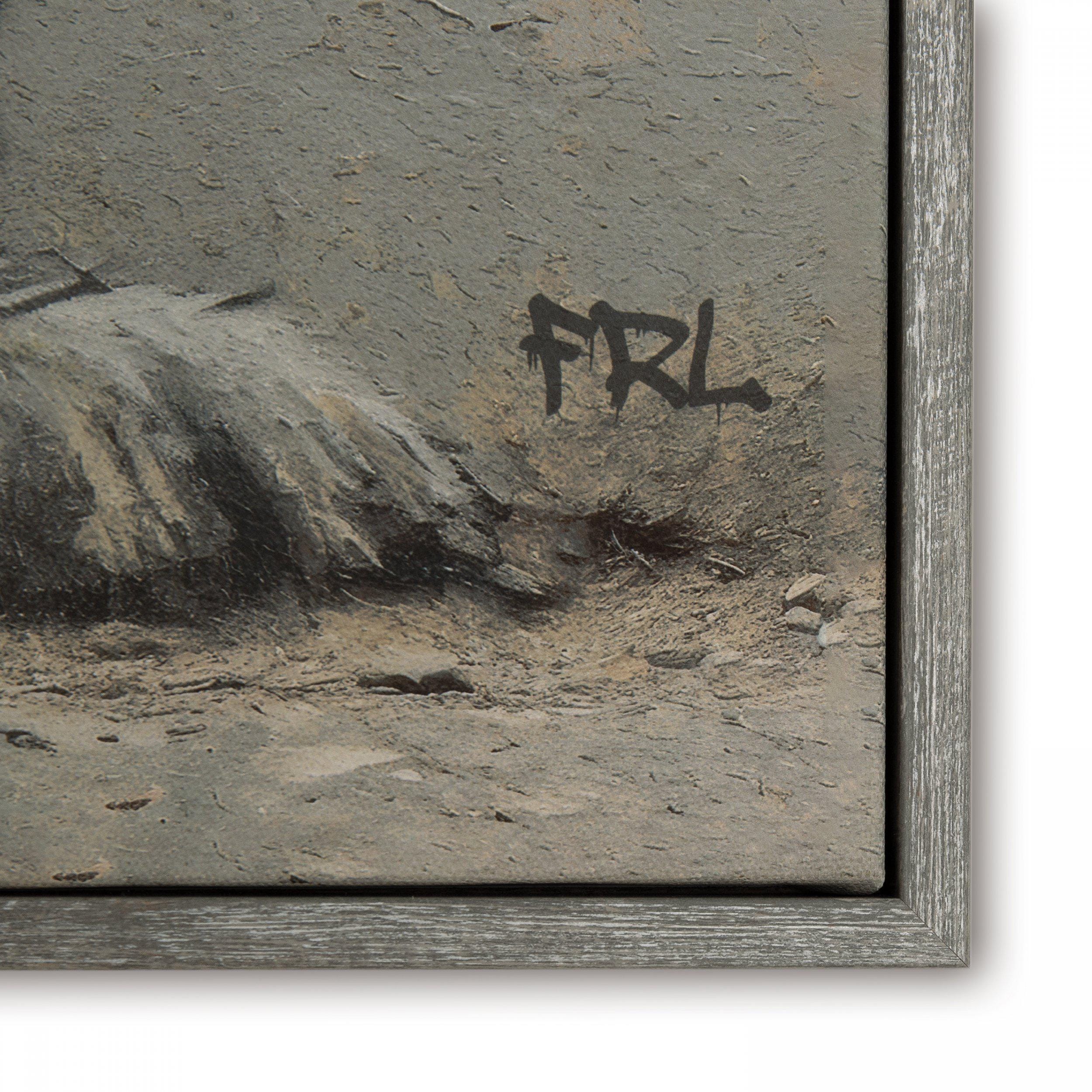 A cute bunny with a hint of mischief stands tall. The interplay between its endearing form and daring demeanour makes for a captivating feature. The urban setting, brimming with texture, enriches the composition. Great attention to detail is applied to the rabbit's coats and portraits, capturing the beauty of the animal's synonymous adorable character. The words " Hop Off" in gold foil graffiti, a playful addition, add extra personality to the fun wall art. A subtle wood effect frame completes the composition.