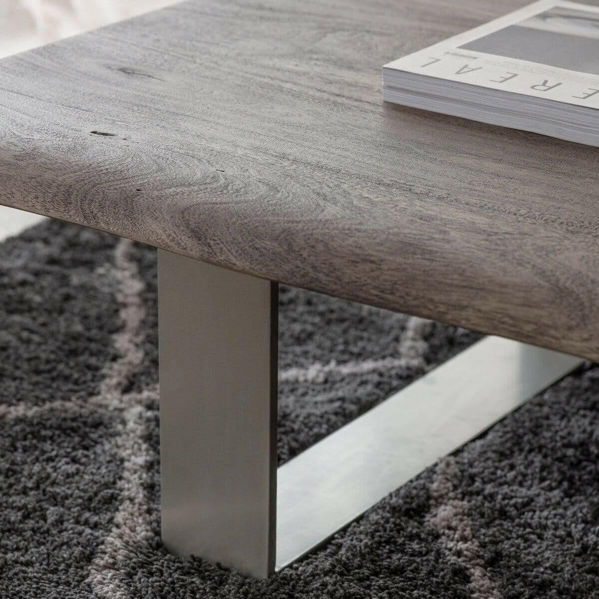 This beautiful coffee table is a new addition to our popular Huntington collection. It makes a perfect addition to any setting, with its lovely acacia wood top with its waney edge, combined with a silver-colour powder coated iron legs.