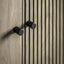 Introducing the Woollard 2 Door Wardrobe, the perfect addition to any room. This contemporary wardrobe features a sleek black finish with a pressed woodgrain effect, giving it a premium look. The door fascias are made of real oak woodgrain veneer with a striking black line pattern. To complete the modern design, a black metal underframe and door handle are included. Matching items are also available to create a cohesive look.