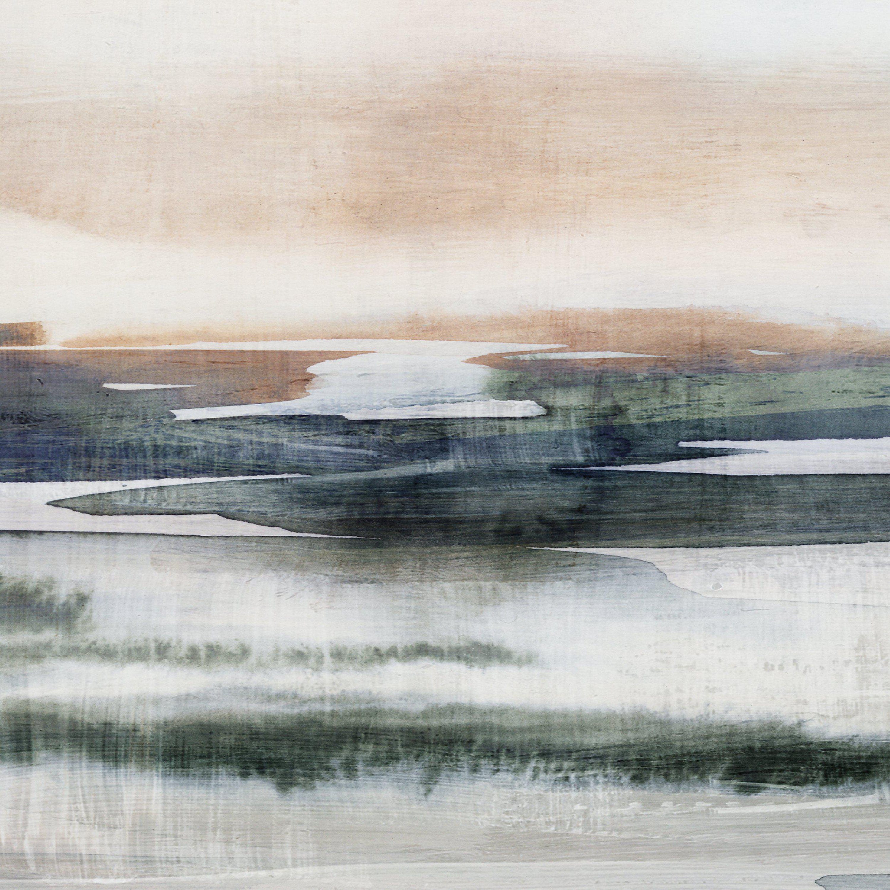 An immersive coastal experience. An abstract print that collaborates a variety of soft hues to create dramatic effects of a shoreline. The canvas, delicately framed, exposes the expansive scene. An alluring sunset is gradually lost whilst the energy of the sea continues.