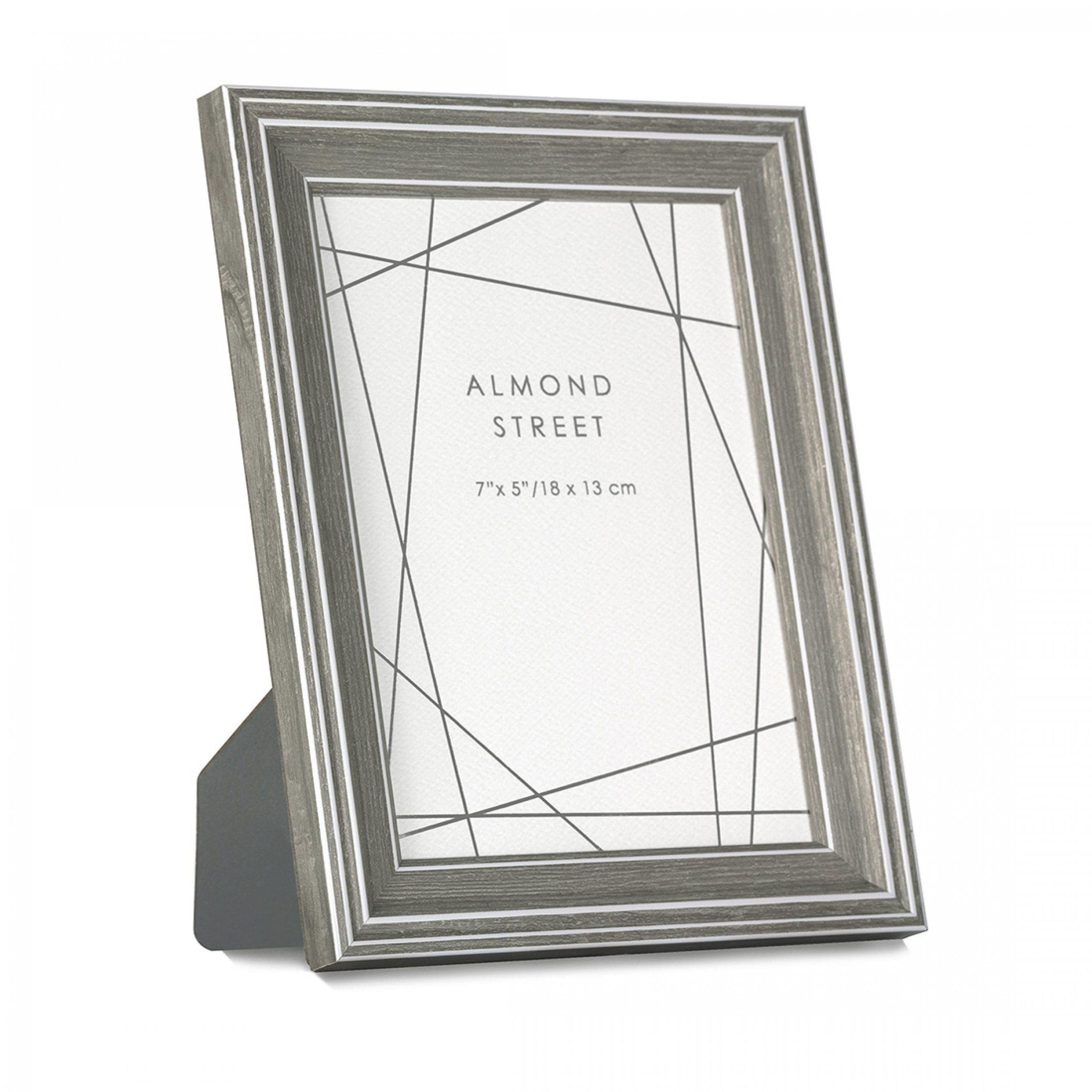 A simple grey wood effect photo frame highlights the nuances found in a textured grain. A chalk-white paint draws attention to the profile edges. Complemented by a grey velvet window opening back, the versatile style is available in two additional sizes 4" x 4", and 7" x 5".