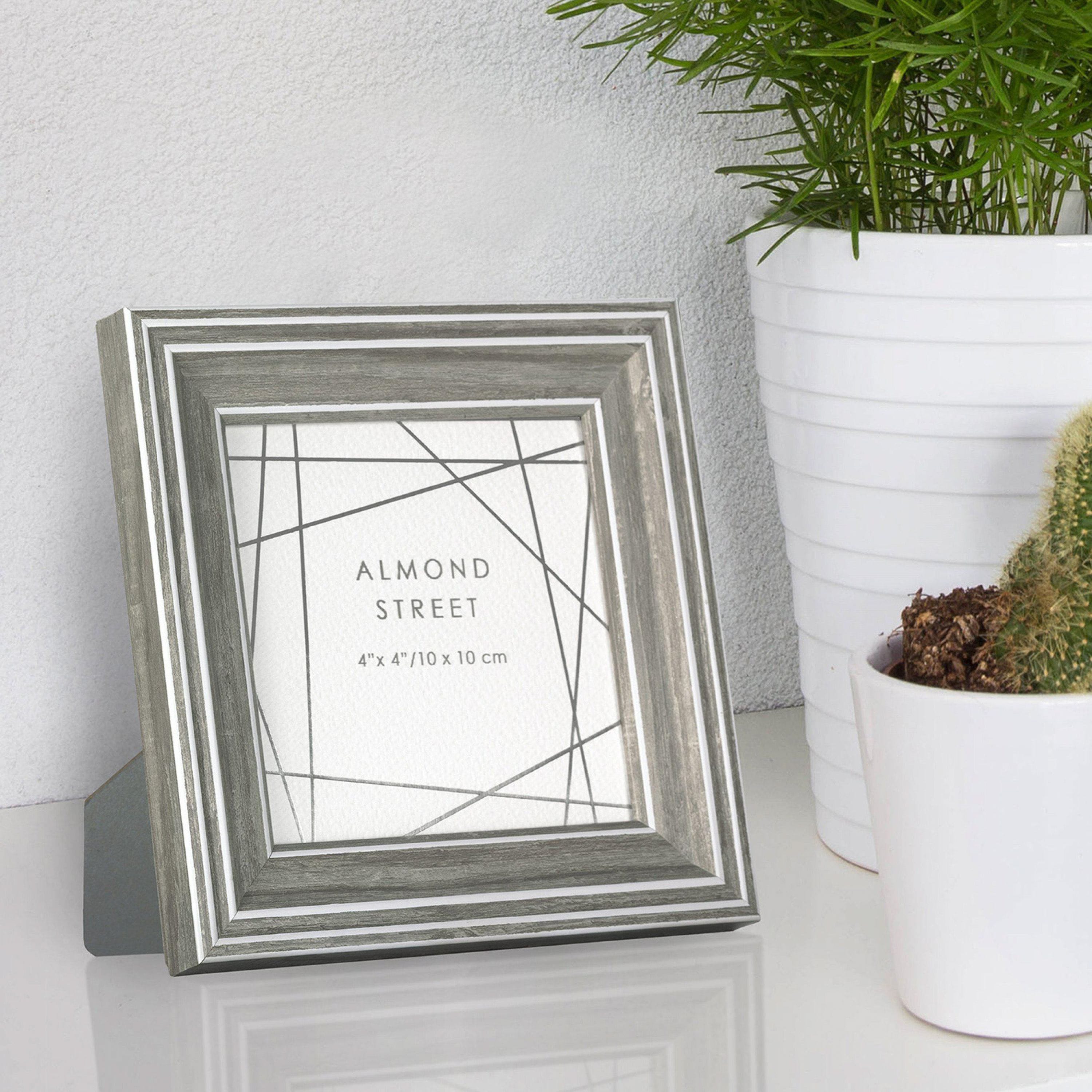 A simple grey wood effect photo frame highlights the nuances found in a textured grain. A chalk-white paint draws attention to the profile edges. Complemented by a grey velvet window opening back, the versatile style is available in two additional sizes 4" x 4", and 7" x 5".