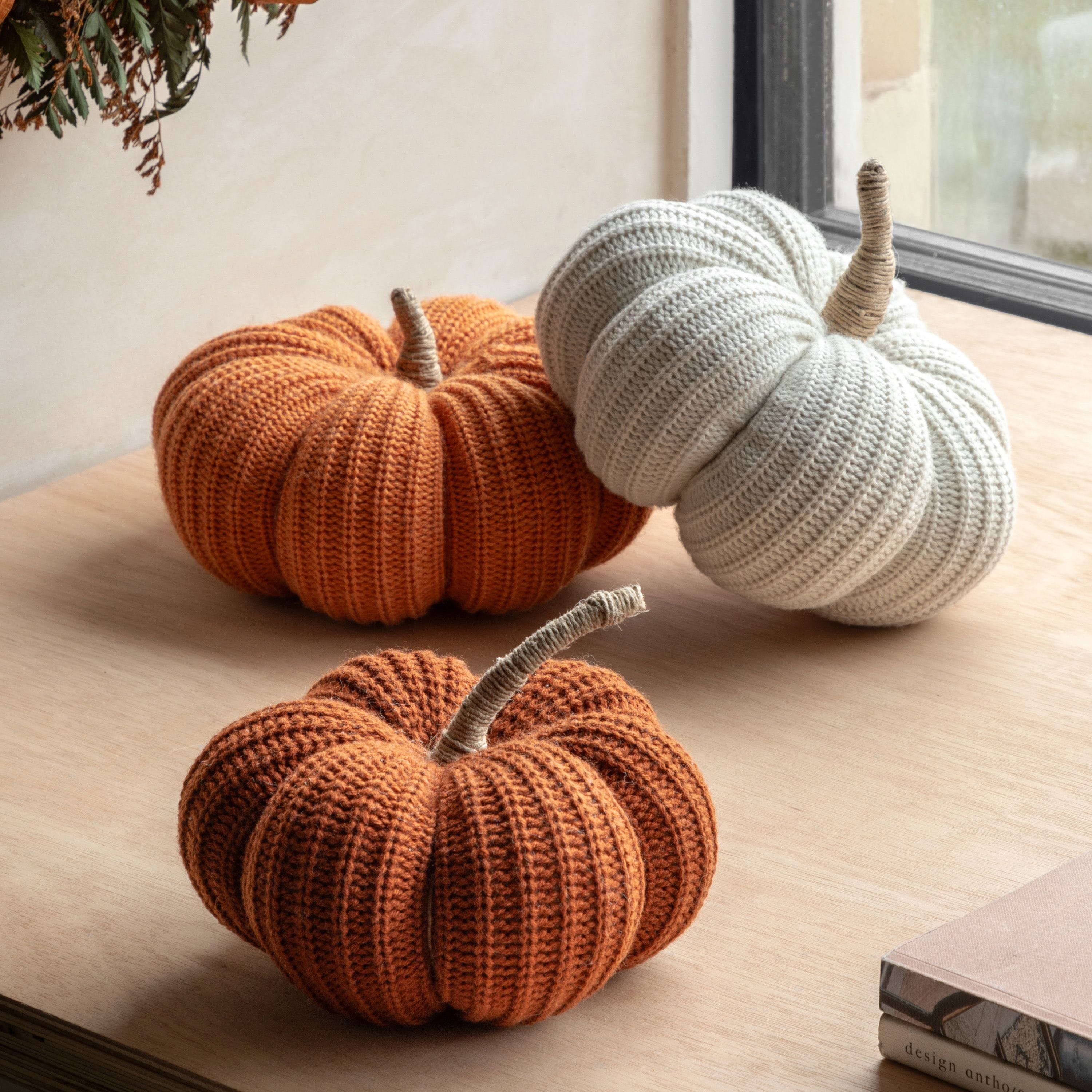 Beautiful knitted pumpkins, perfectly on trend to add to autumnal home decor.