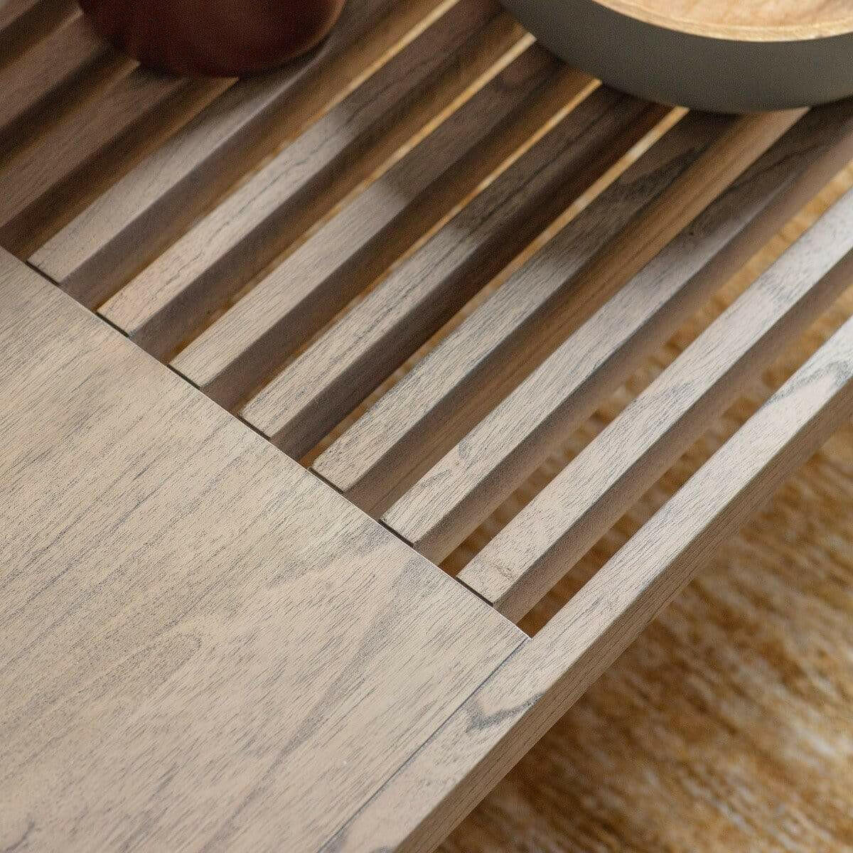Our Kyoto collection has been developed with Japandi influences to give the ideal fusion of Japanese and Scandinavian design. This beautiful coffee table, crafted from Mindy ash, features an unusual slatted central section, adding a stylish design feature. The Kyoto is the perfect range to add a touch of unique style to any interior, featuring a traditional lightly weathered finish with modern slatted detailing, hand-woven cane and brushed bronze handles. Also including a media unit, sideboard, cupboard and console table, plus a practical supper table and unique slatted side table, this collection adds a touch of simplistic minimalisation to any interior space.