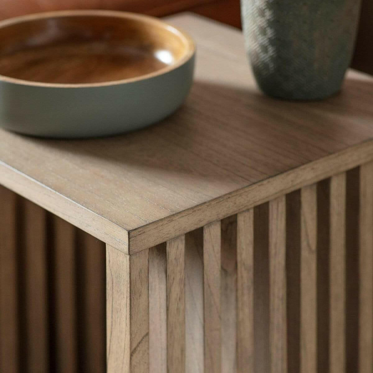 Our Kyoto collection has been developed with Japandi influences to give the ideal fusion of Japanese and Scandinavian design. This beautiful side table, crafted from Mindy ash, features slatted sides, adding a stylish design feature. The Kyoto is the perfect range to add a touch of unique style to any interior, featuring a traditional lightly weathered finish with modern slatted detailing, hand-woven cane and brushed bronze handles. Also including a media unit, sideboard, cupboard, coffee and console table, plus a practical supper table, this collection adds a touch of simplistic minimalisation to any interior space.