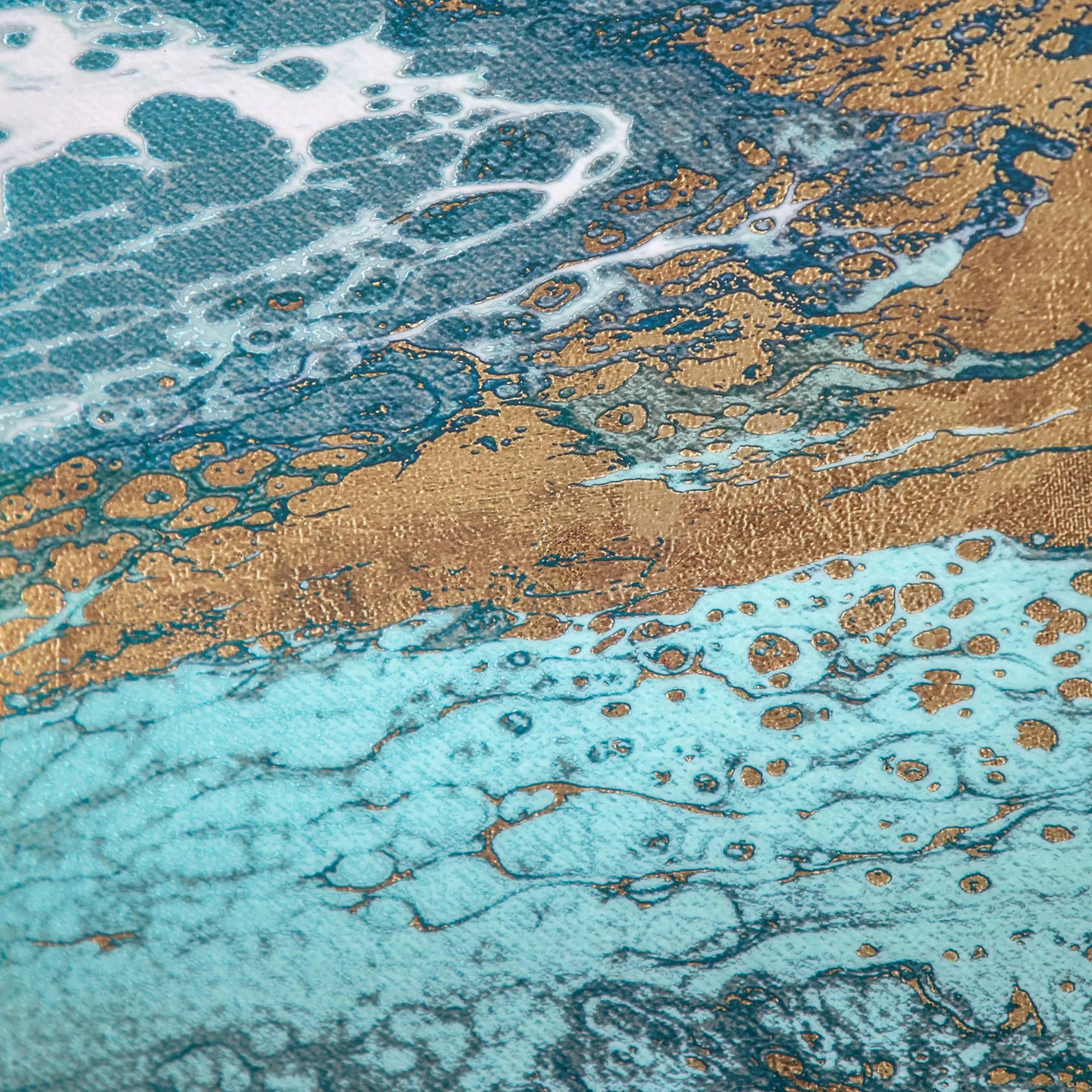 Create a stunning focal point with this canvas. This captivating piece evokes the serene depths of a lagoon, with swirling blues, greens, and hints of gold creating a sense of movement, depth, and tranquility.