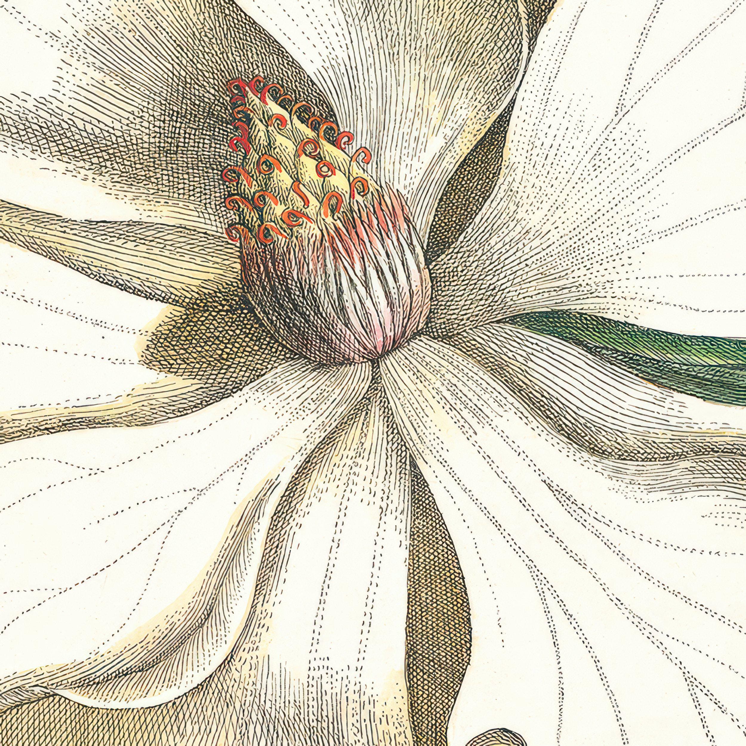 Mark Catesby (1683-1749) was an English naturalist, artist, and explorer known for his significant contributions to early American natural history. He is best remembered for his monumental work in the publication -The Natural History of Carolina, Florida, and the Bahama Islands. The botanical illustration of the Magnolia tree (The Laurel Tree of Carolina) in Volume 2 is a masterpiece that captures the tree's beauty in all its glory. Against an ebony background, the stunning stem showcases the large aromatic flower and the exotic pink fruit, creating a visual treat for the eyes. A slimline mottled gold frame presents the beautiful canvas.