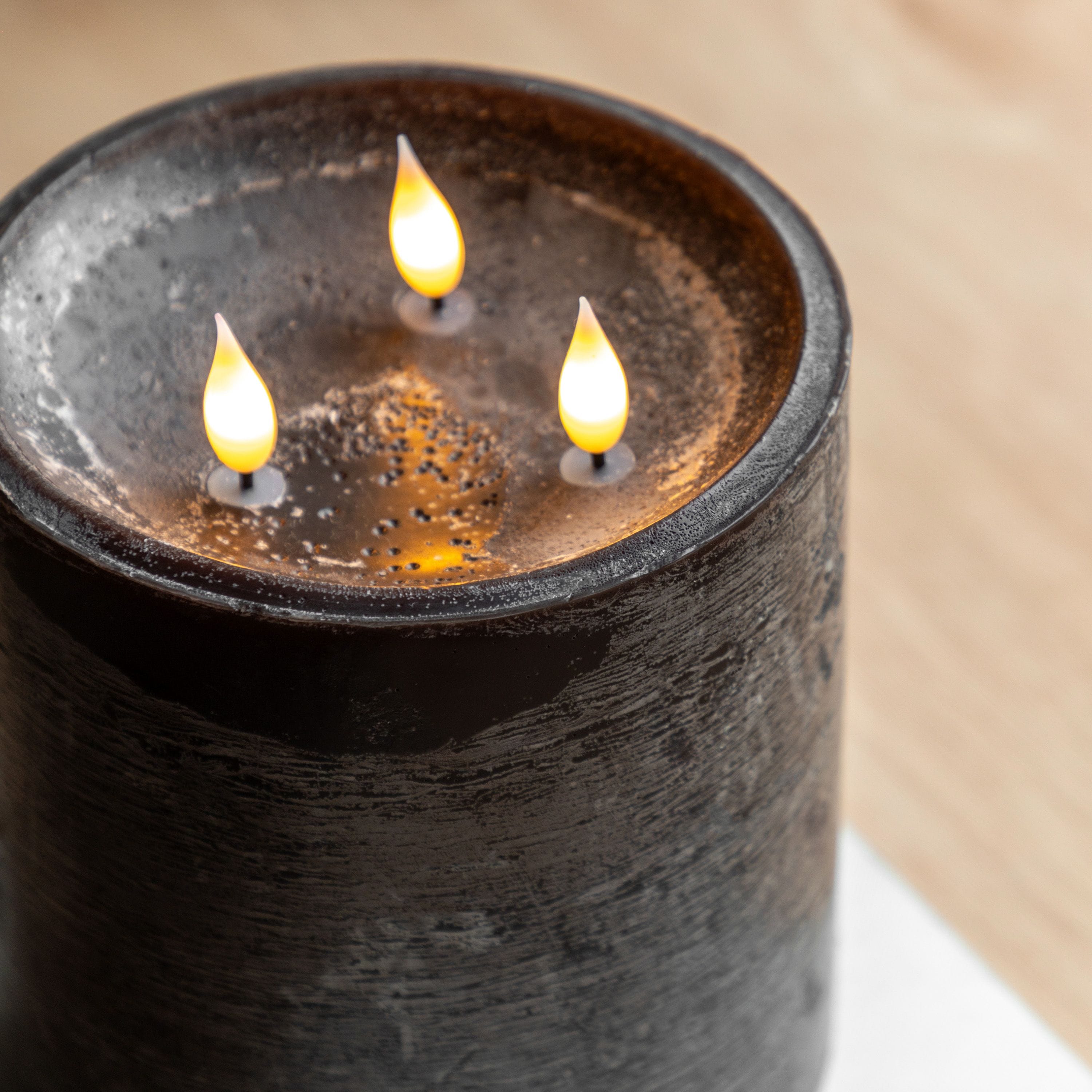 Enjoy the flicker of candle light worry free with this 3 wick LED candle. The rustic wax effect finish adds to the realistic feel, while the 3 LED lights give a gentle glow. Remote controlled for easy use.