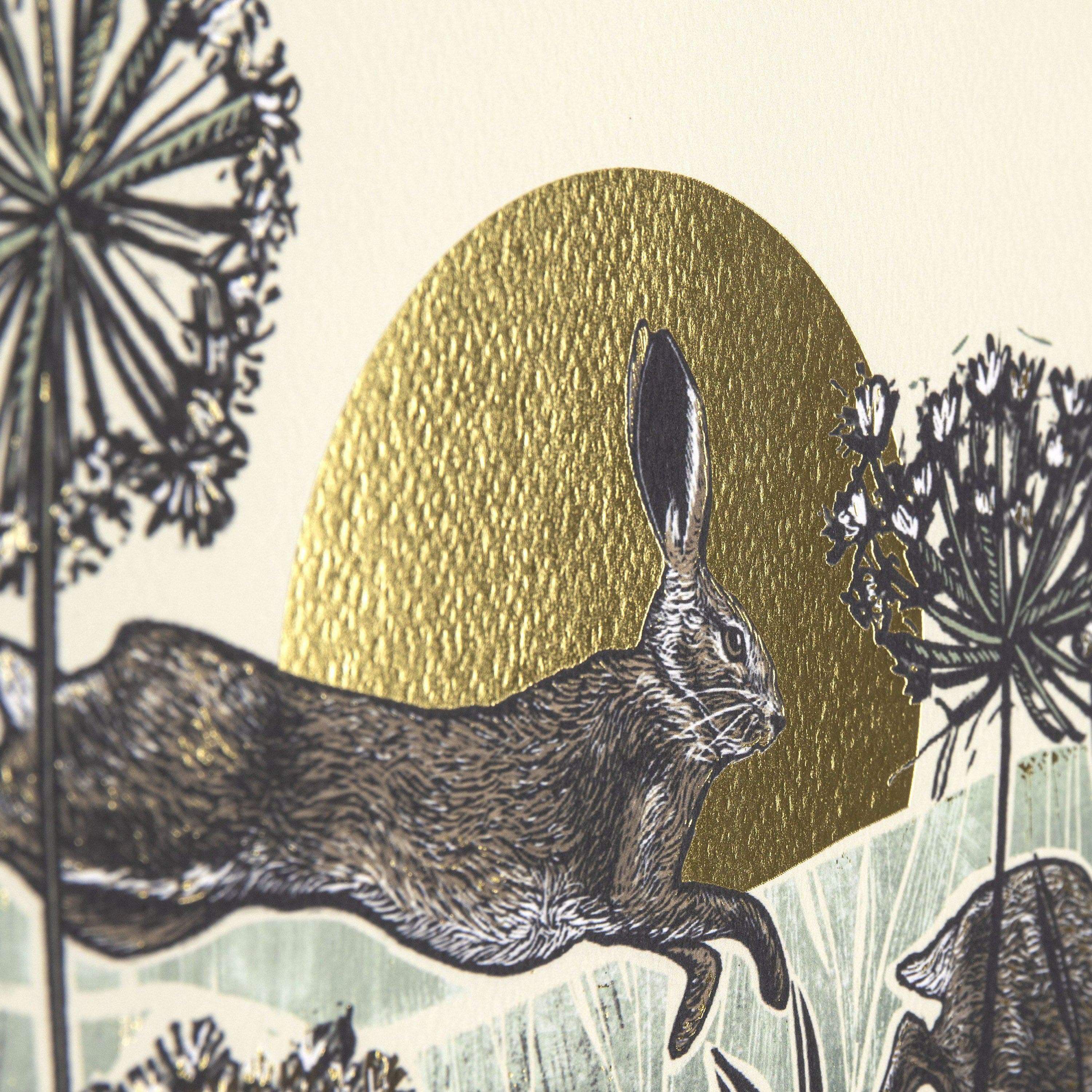 Effortlessly clearing the ferns and foliage at the meadow's fringe, a pair of mad March hares greet the daybreak... Artful use of torn and raised paper and gold foil adds depth, texture and heartening warmth.