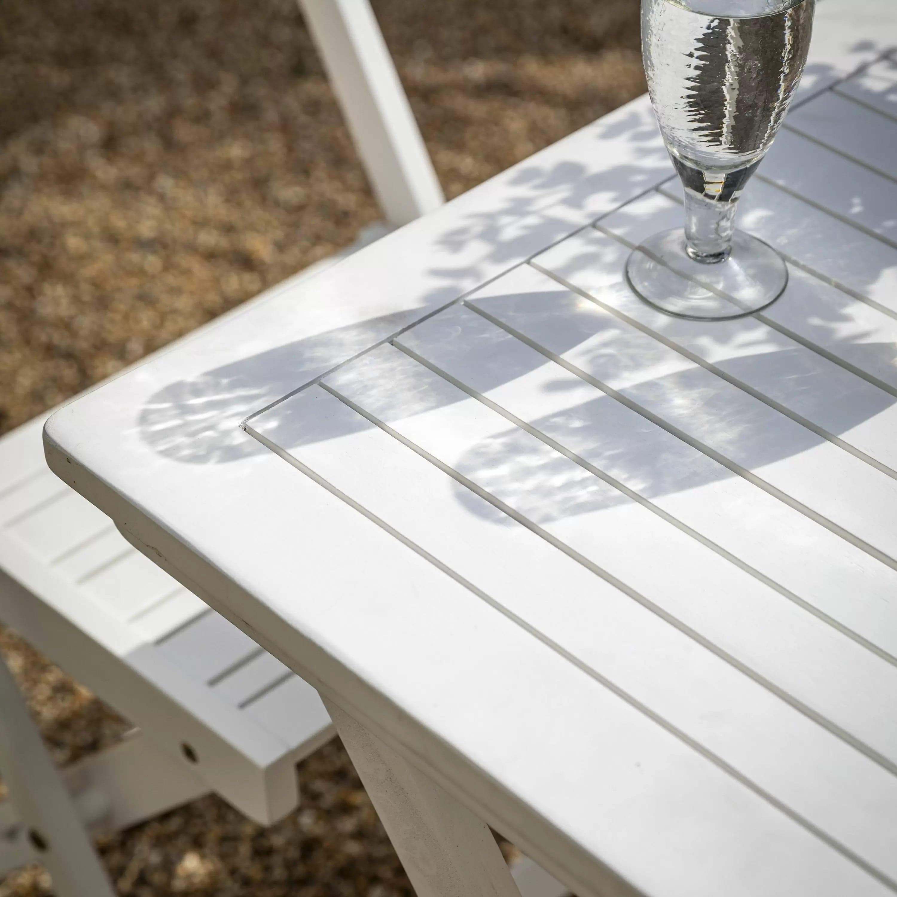 Lindos White Foldaway Dining Set is the perfect combination of practicality and style. This dining set is designed to fold away for easy storage or transportation, making it a convenient addition to any home. The set includes a folding slatted top dining table and four folding chairs, all in an elegantly simple white color.