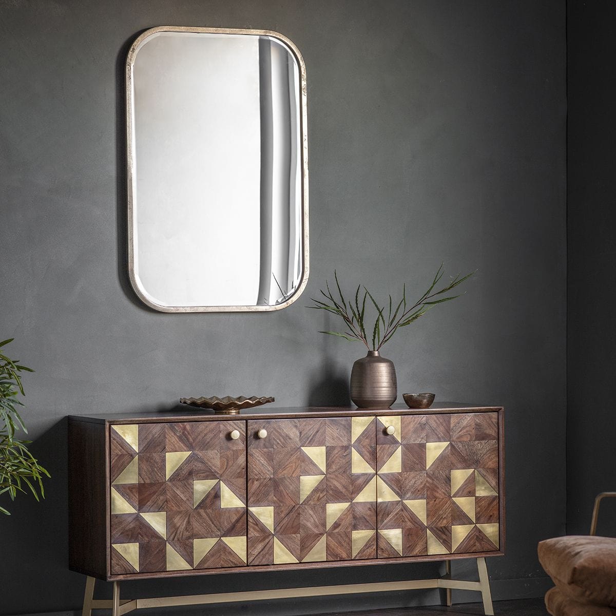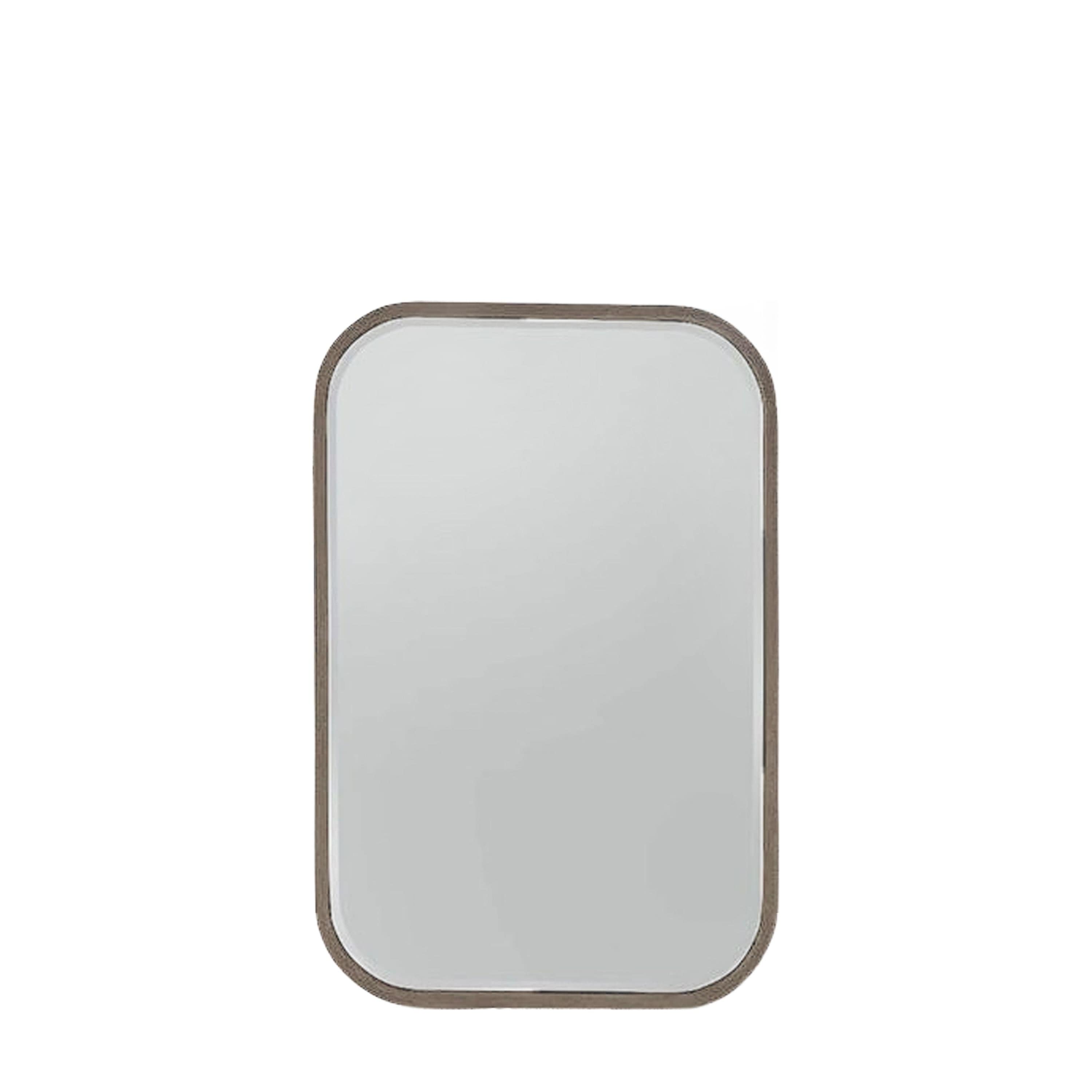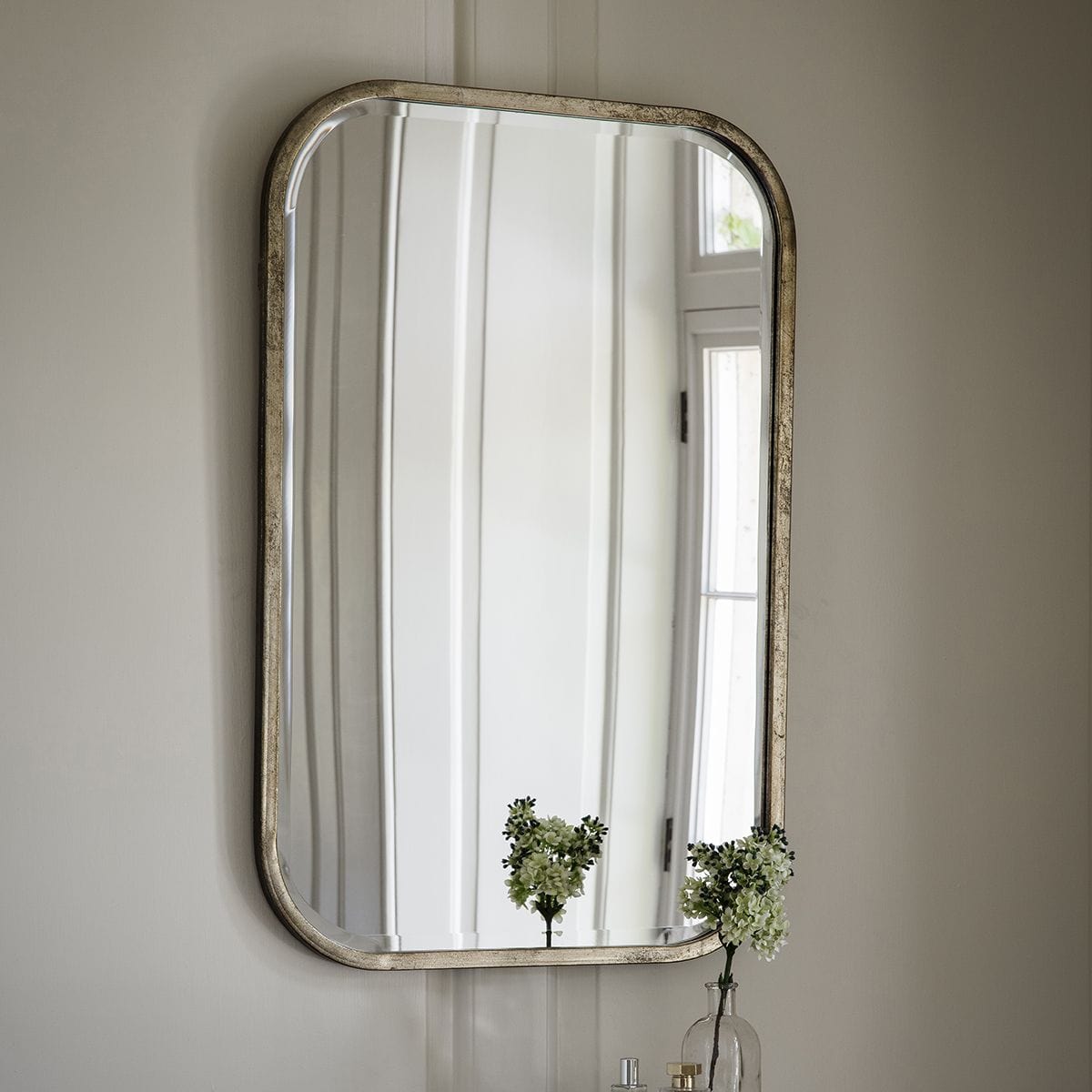 Contemporary wall mirror featuring simple curved corners in a distressed champagne finish.