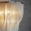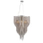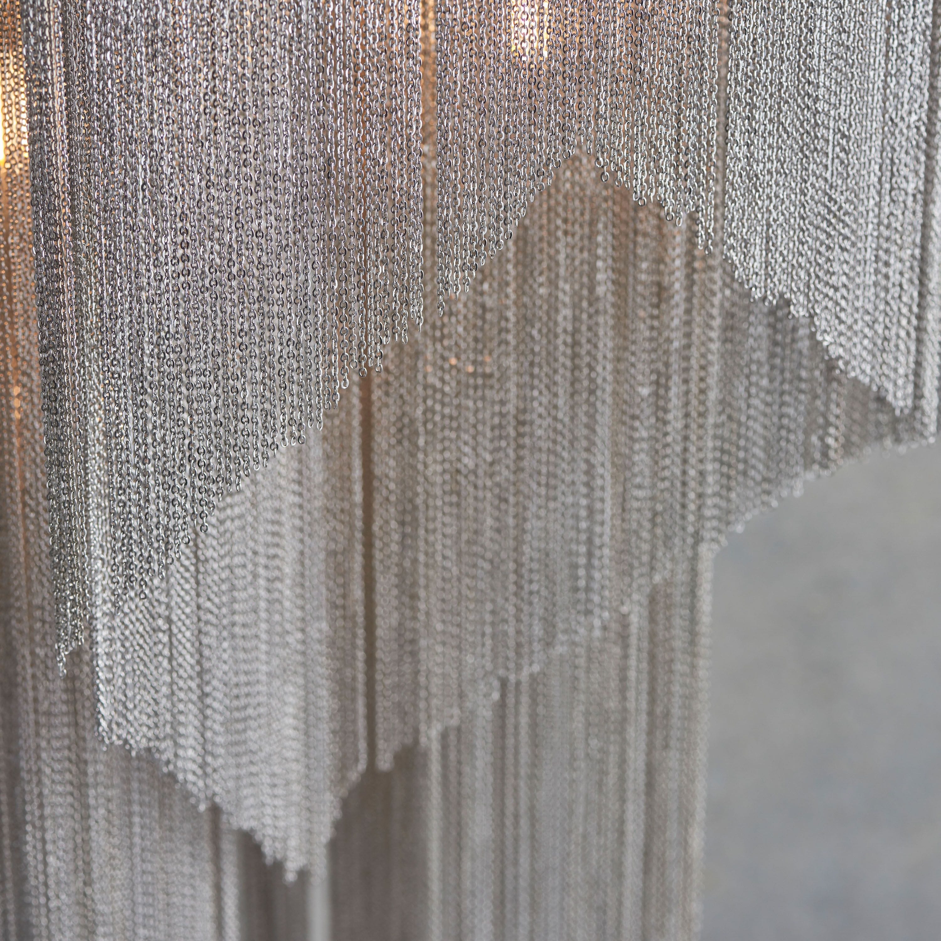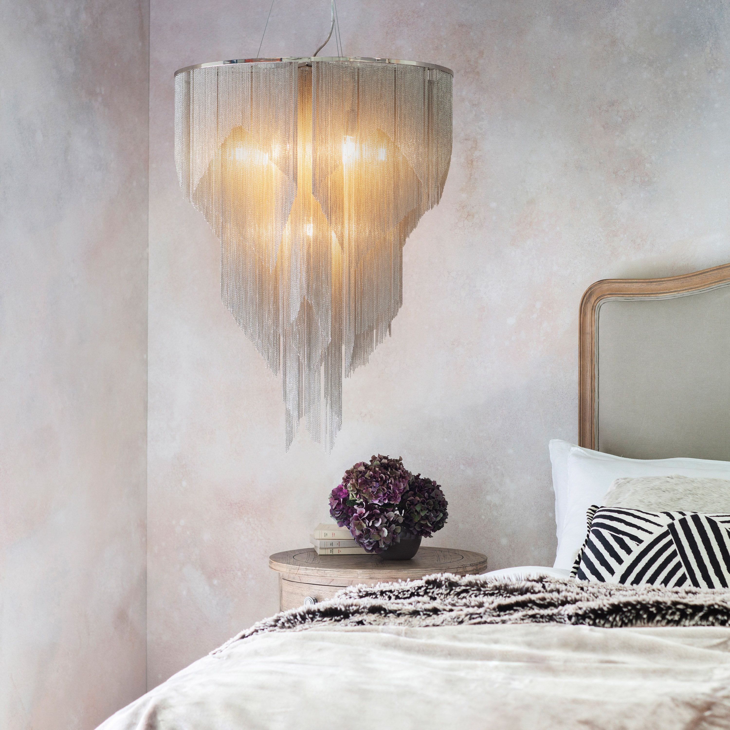 The Loire six light pendant delicately hand dressed with thousands of beautiful fine chains, creating a lavish work of art. The perfect centre piece. Carefully suspended from height adjustable delicate wire with clear flex. Create a beautiful diffused light with the use of LED filament lamps.