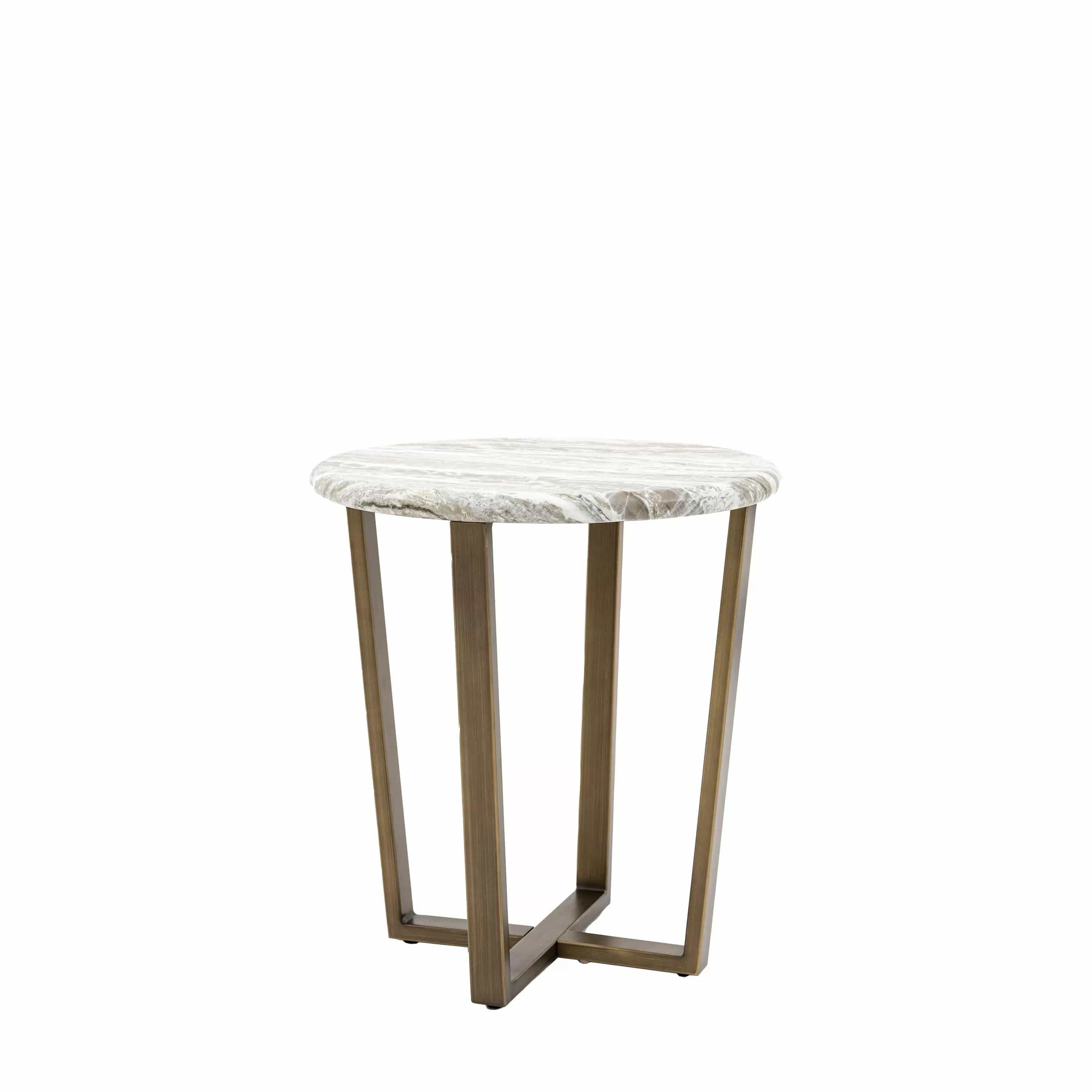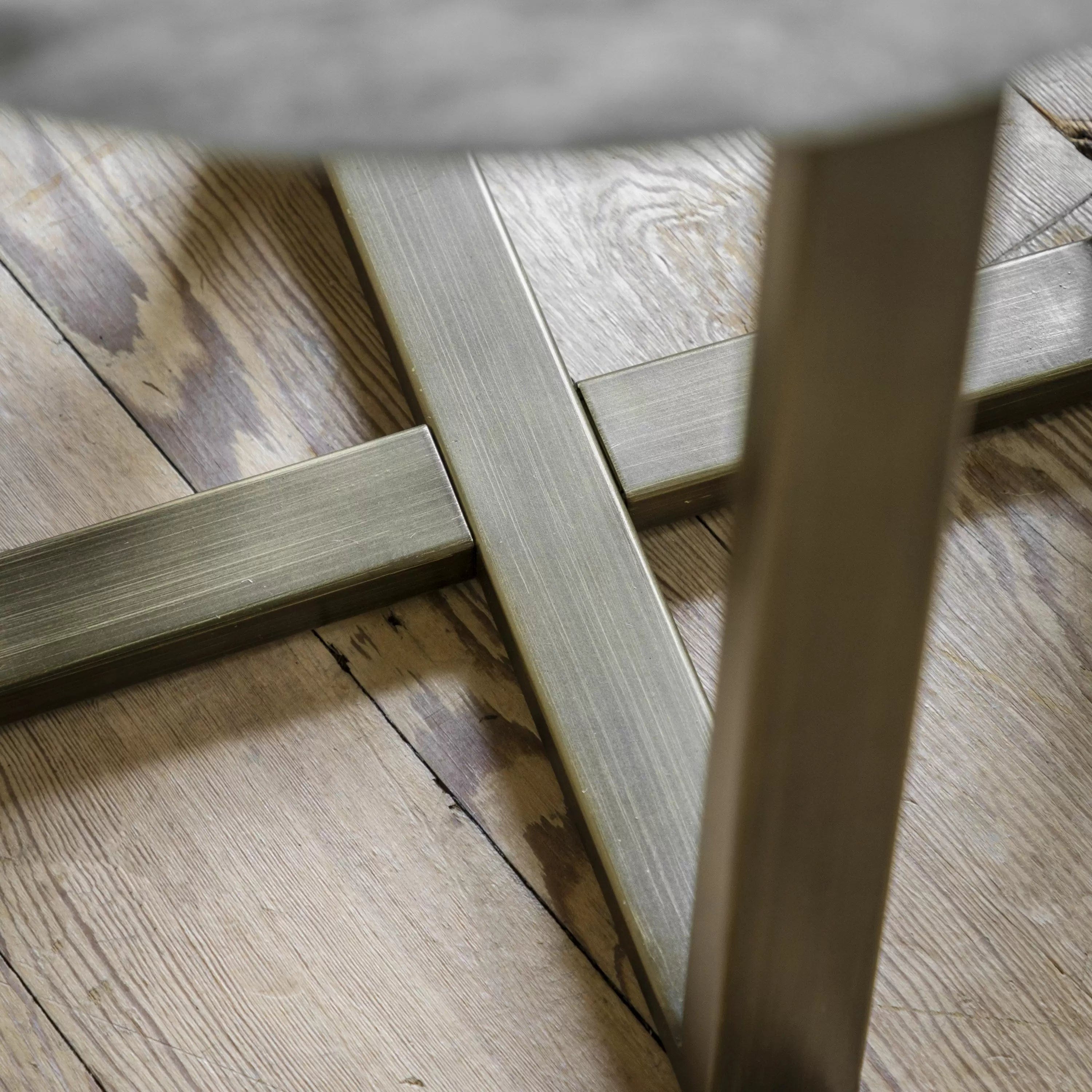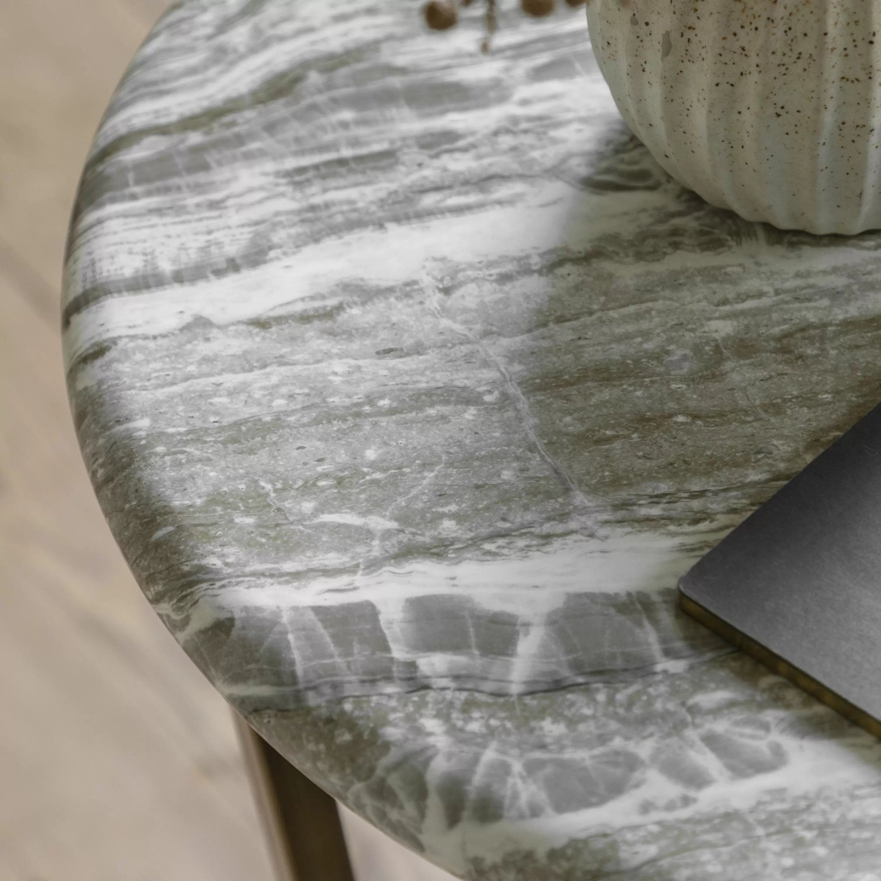 This lovely side table will add a touch of sophisticated elegance to a room. The stunning top features the most amazing green-grey marble faux finish which is created with the latest state of the art technology to give the look and feel of the real thing but without the weight and technical difficulties. The faux marble is perfectly complemented by the metal base which has a classy bronzed brass finish, to give an understated luxury style, perfect for any classic modern interior. Matching items also available.