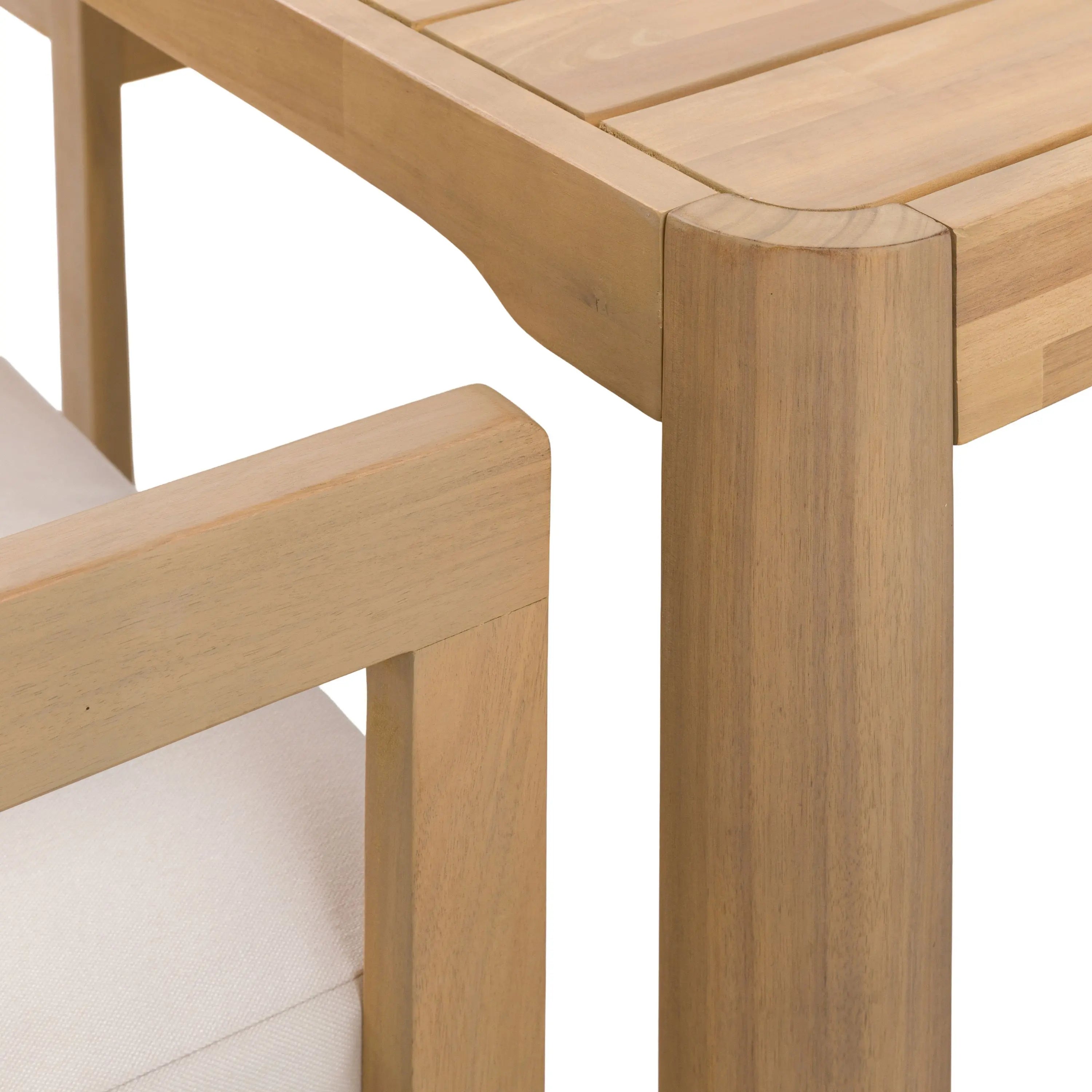 Enjoy the summer sun in style with this modern lounge set. The chic 2 seater sofa, 2 armchairs, side table and coffee table are crafted from beautiful Acacia wood, with sleek soft curves and clean contemporary lines, giving outdoor spaces a modern, elegant update. The sofa and armchairs are topped with deep filled cushions for truly relaxing comfort.