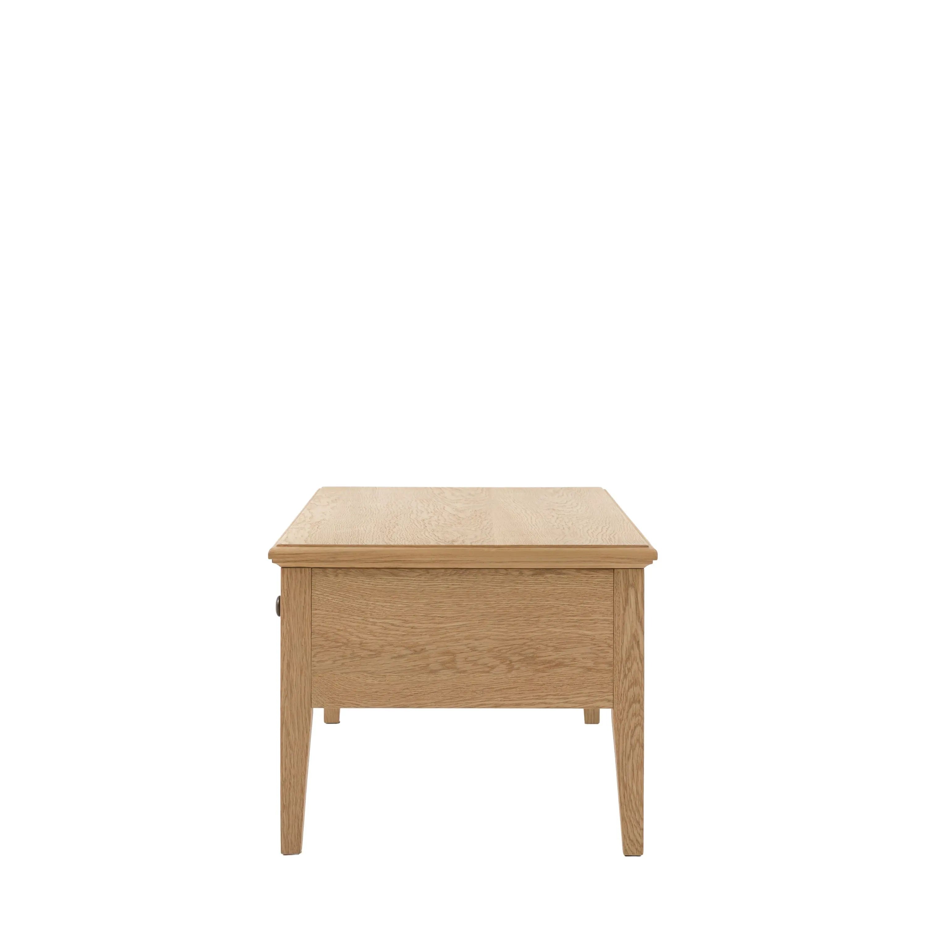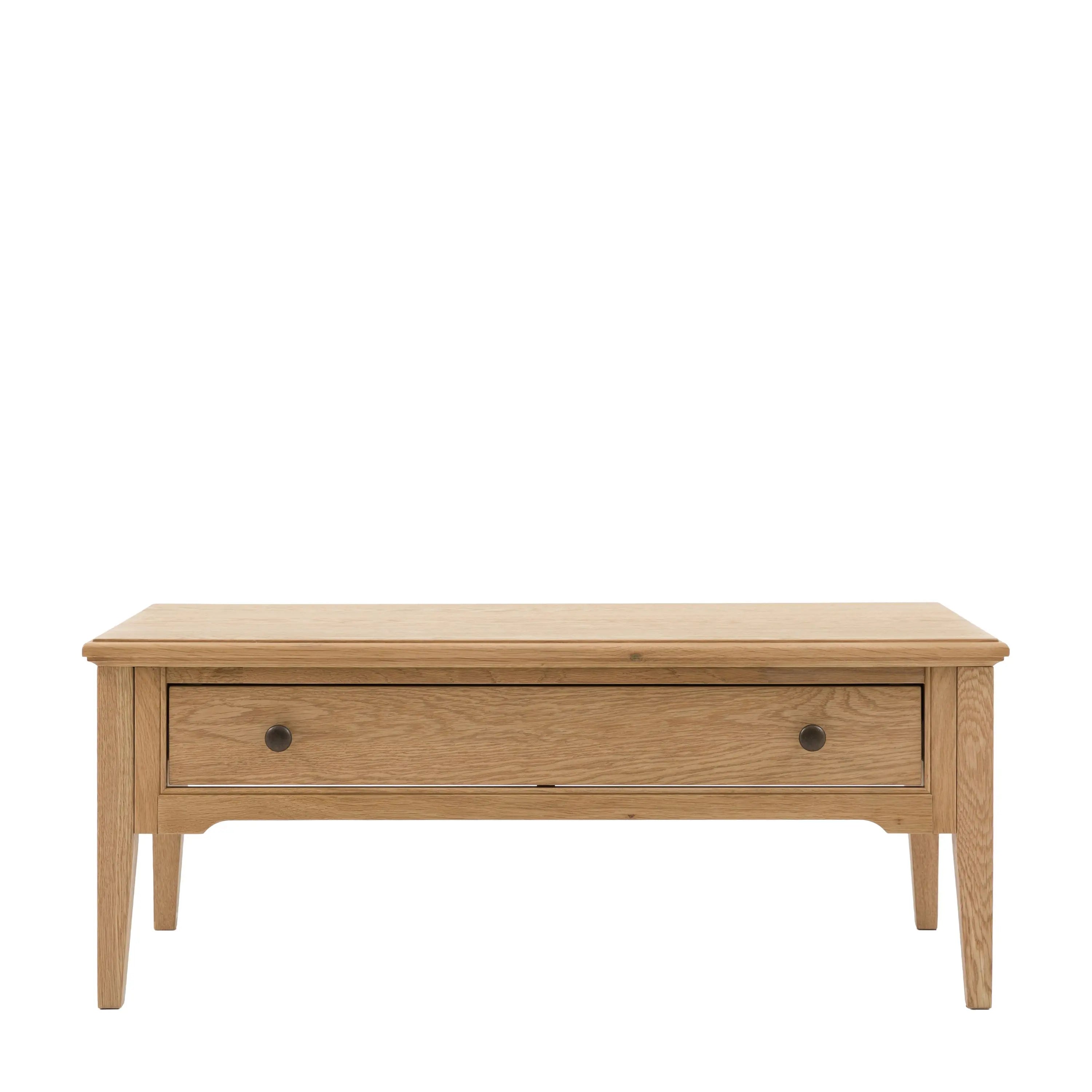 Brighten your living space with this elegantly practical coffee table. Crafted from beautiful oak solids & veneers, full of subtle grain detail and natural beauty, the coffee table features a single spacious drawer, perfect for keeping remotes, magazines, and essentials neatly out of sight. The classic round handles add a touch of timeless charm, making it a beautiful and functional centrepiece for any living space.