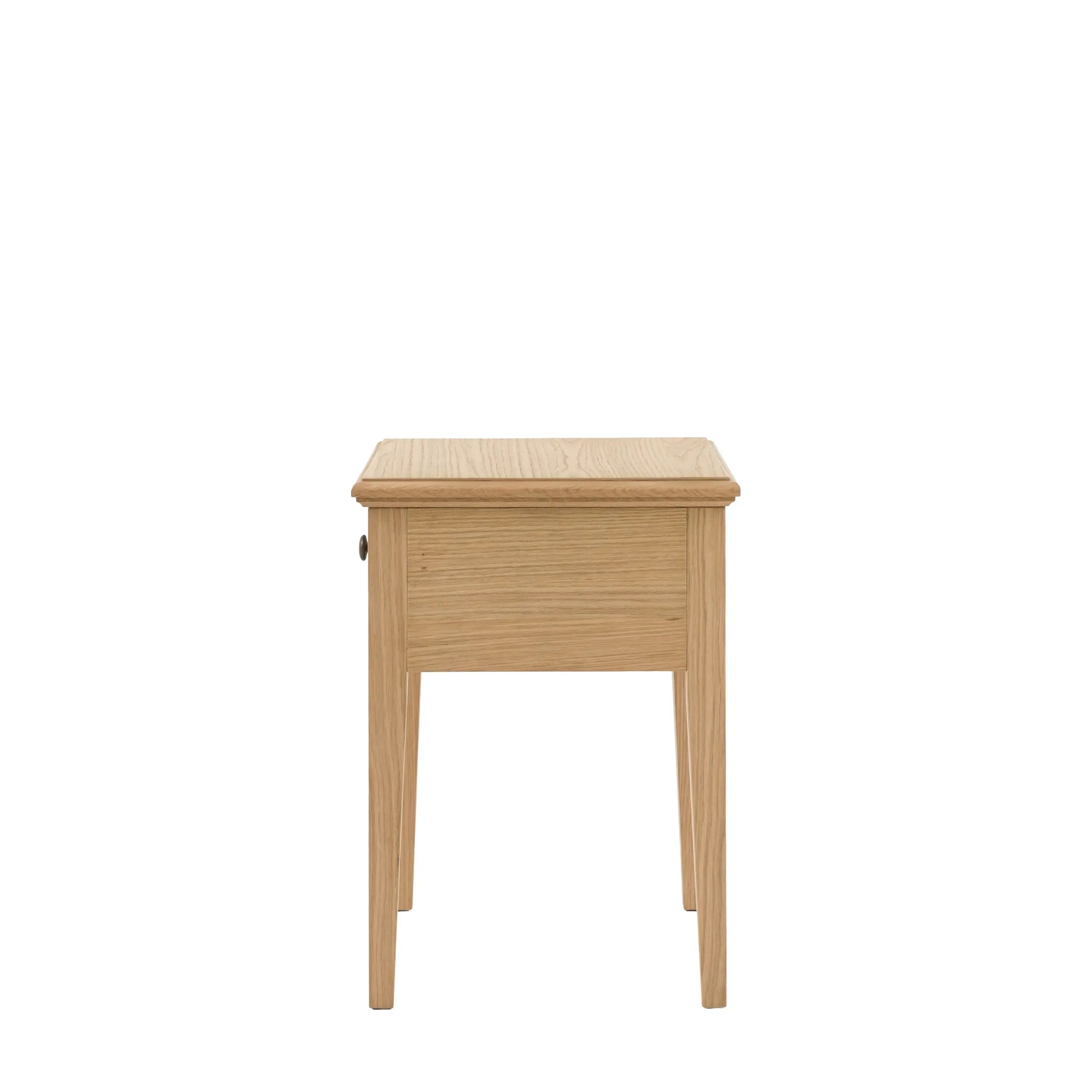 Introduce elegant simplicity to your living space with this charming side table. The elegant design, crafted from beautiful oak solids & veneers, offers a light and airy feel while showing off the subtle grains and natural beauty. A single convenient drawer, accented with a classic round handle, provides the perfect spot for your essentials, blending timeless style with effortless functionality.