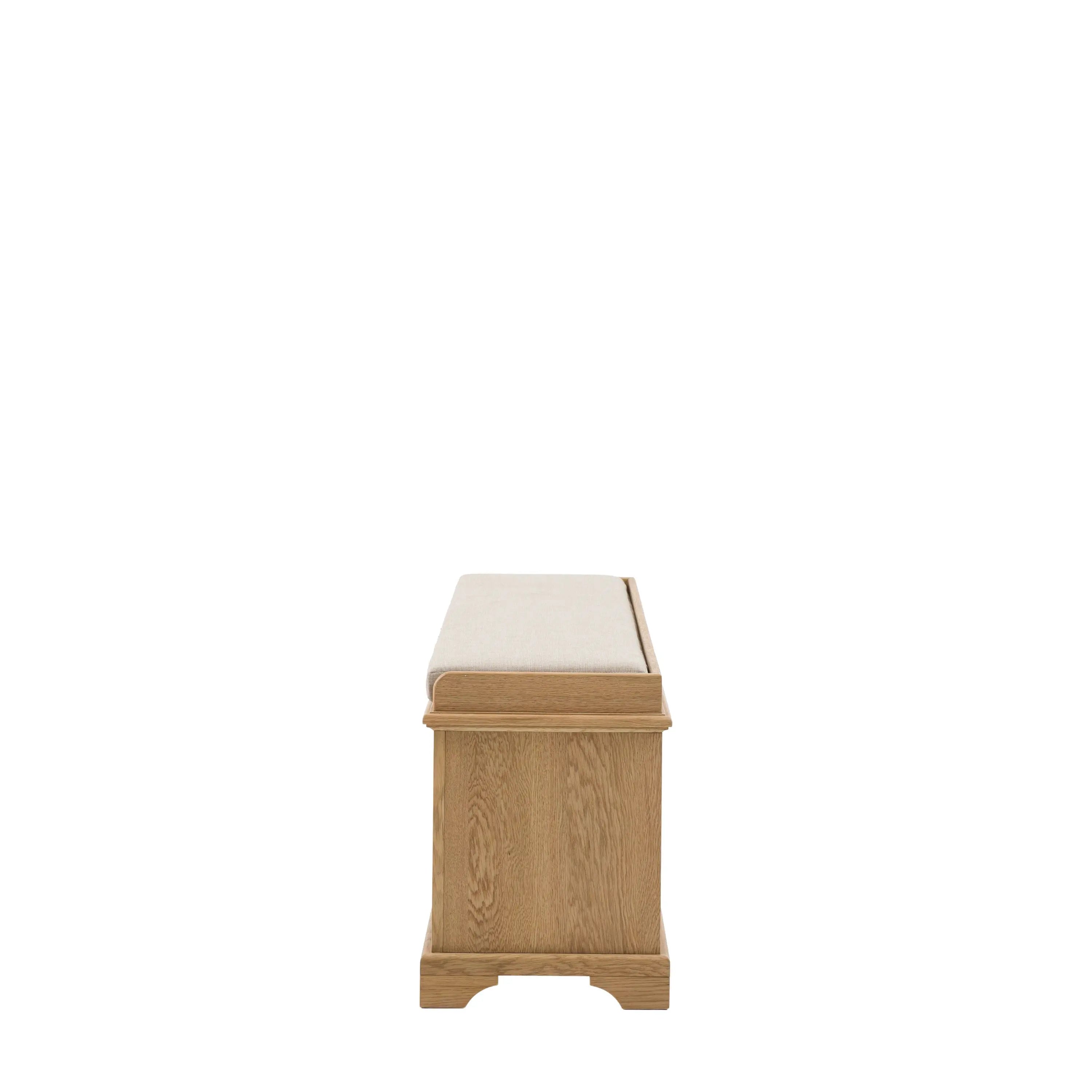 Welcome functionality and style into your home with this versatile hall bench. Perfect for your entryway, the bench features a comfy, natural toned upholstered cushion for seating and six open cubbies, ideal for organising shoes, bags, or other essentials. The wooden frame is crafted in solid oak & veneers, full of subtle grain detail and natural warmth, adding a touch of natural charm to any space.