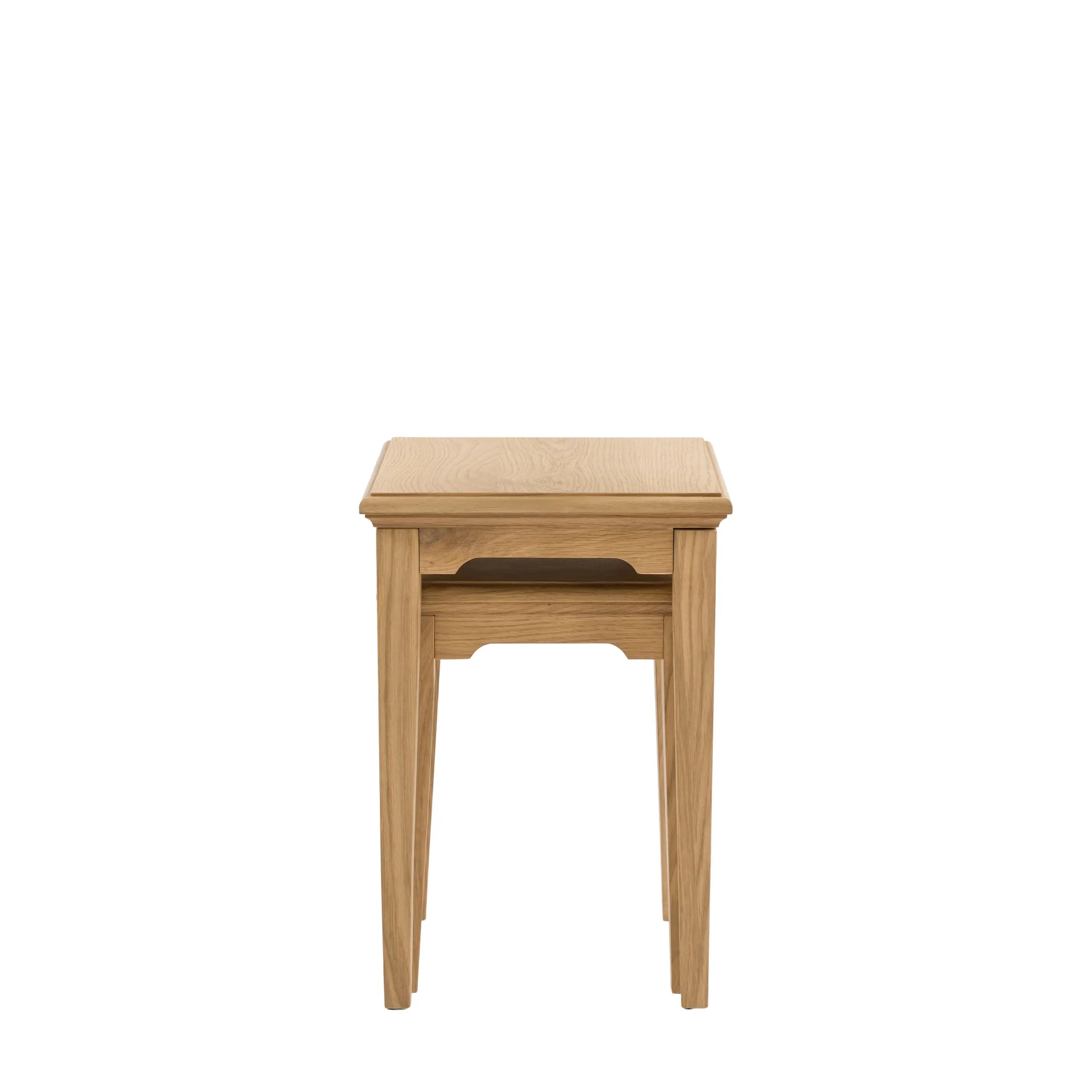 Maximise your living space with this charming wooden nest of tables. Perfect for smaller rooms or simply creating an adaptable living space, these two tables can be used together as a multi-tiered stack or separately as a pair of convenient side tables. The warm, natural oak solid & veneers are full of subtle grains, adding a touch of rustic elegance and timeless style, offering both natural beauty and remarkable versatility.