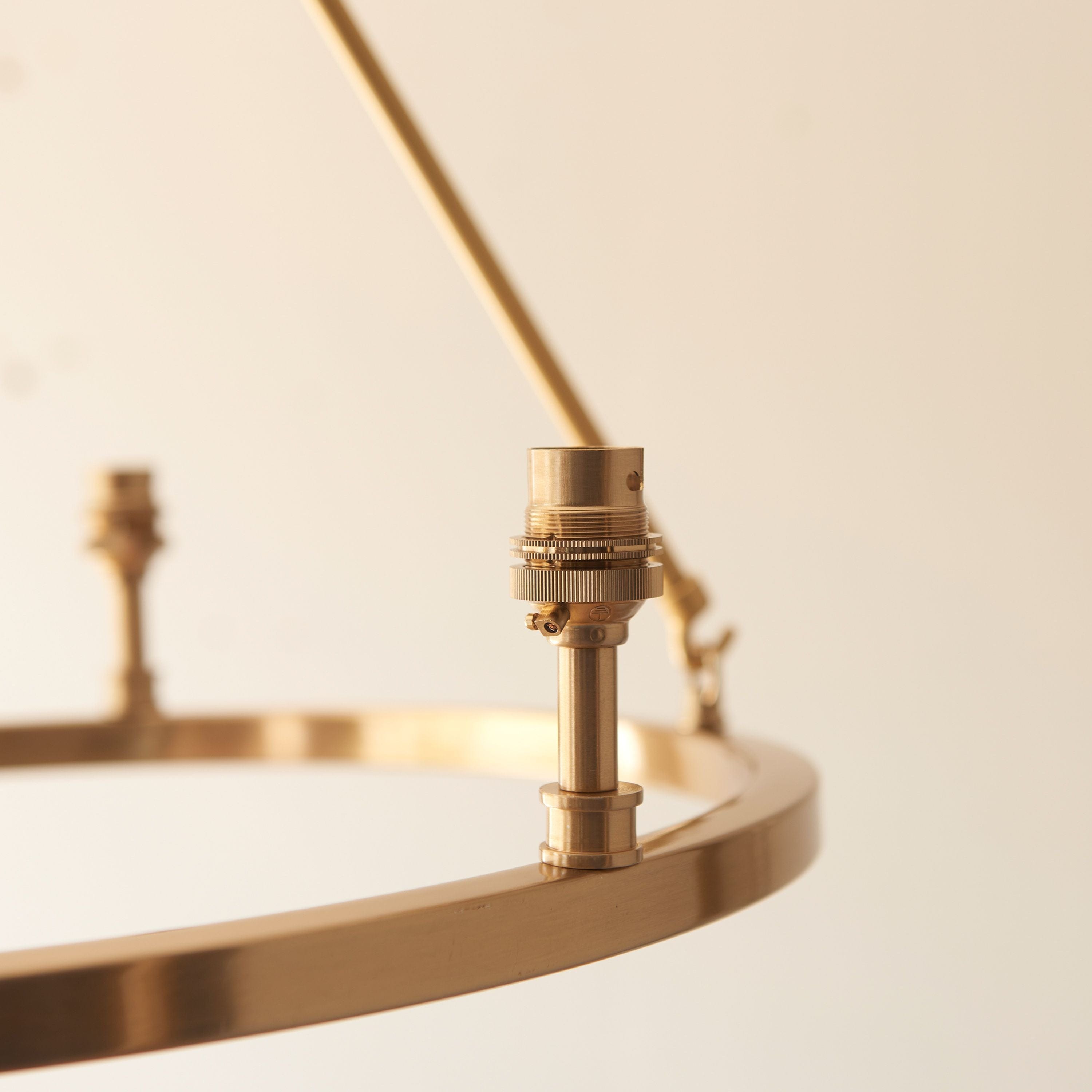 The timeless simplicity of a hoop design finished in aged brass plate with authentic brass B22 lamp holders makes the Manchester the perfect addition to your home. With height adjustable chain and twisted fabric flex. This is a fitting only pendant, complete the look with 6 of our 16cm decorative fabric shades for a timeless chandelier to be proud of.