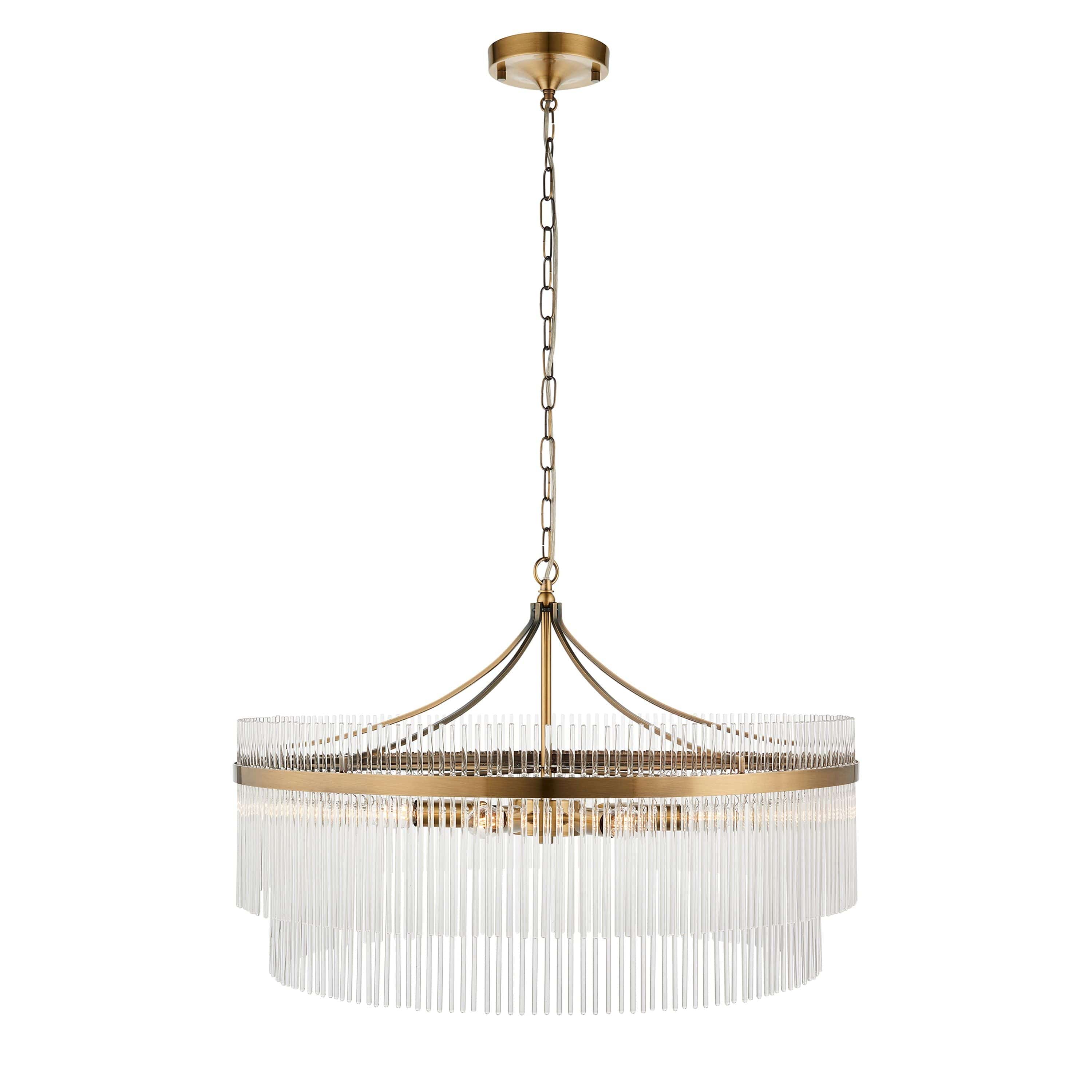 Introducing the Mariette Grand 7 Pendant Light Antique Brass, now available at House of Isabella. This stunning light fixture is finished in antique brass and features clear glass rods that delicately diffuse the light. It is suspended from a height adjustable chain and comes with a clear flex, making it easy to install in any room.