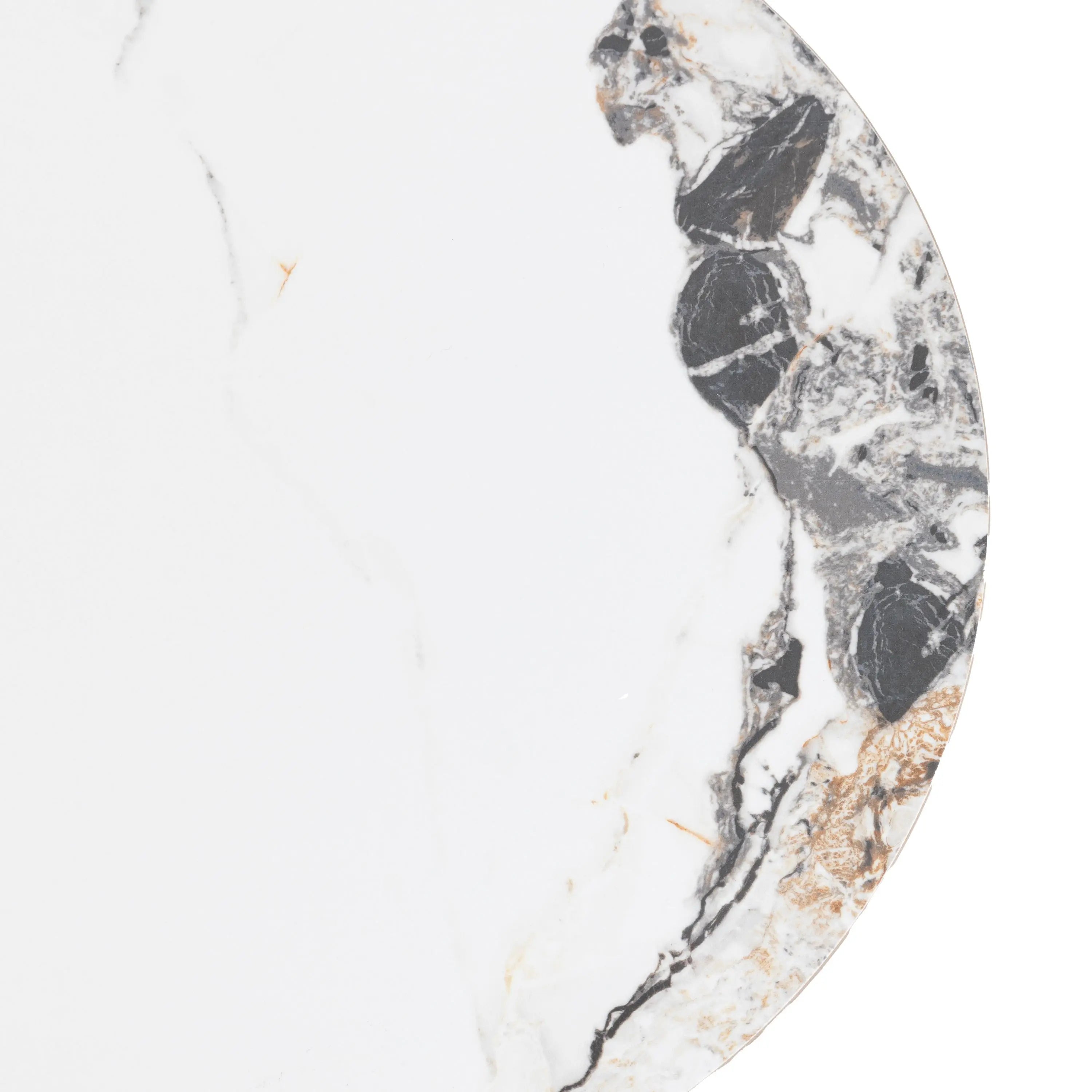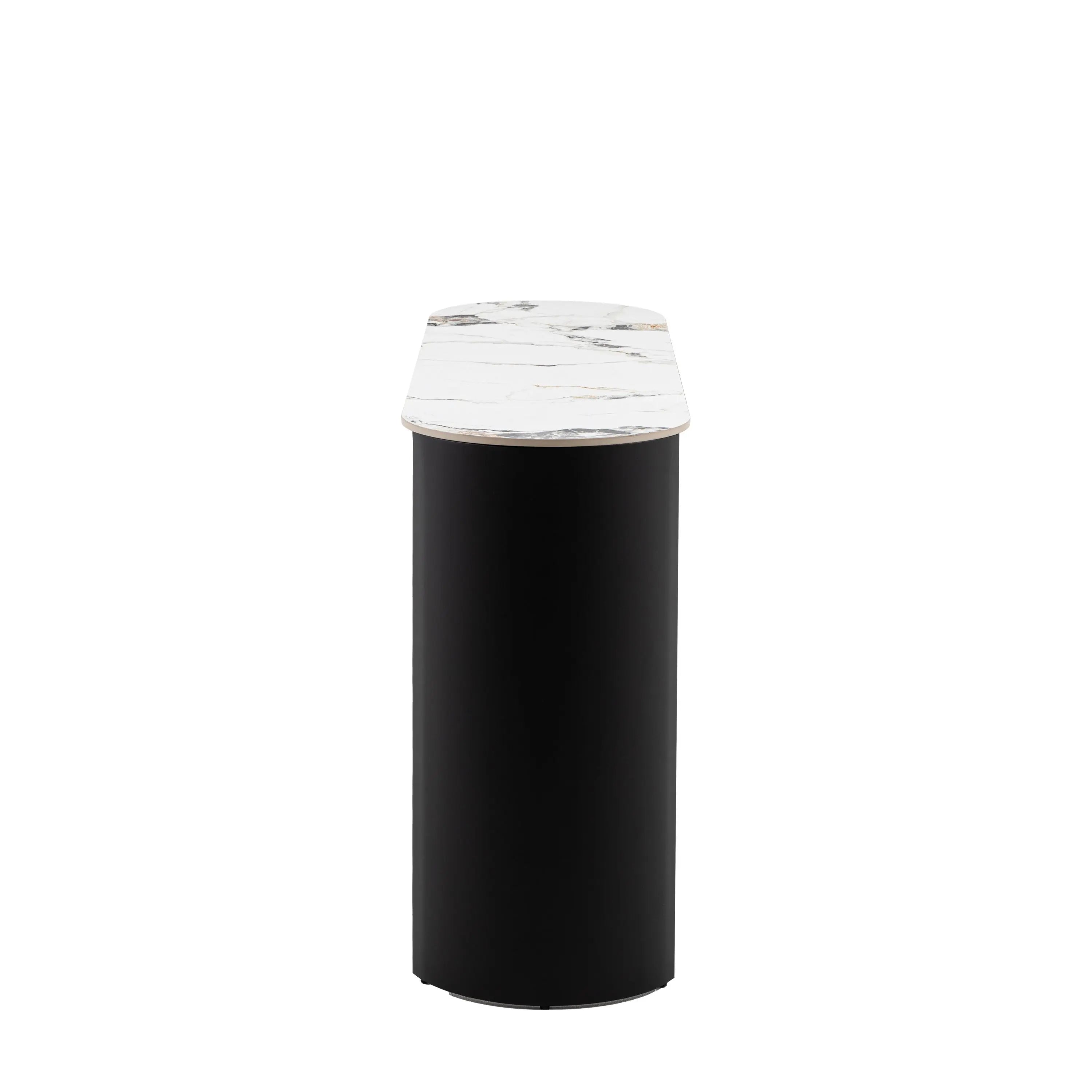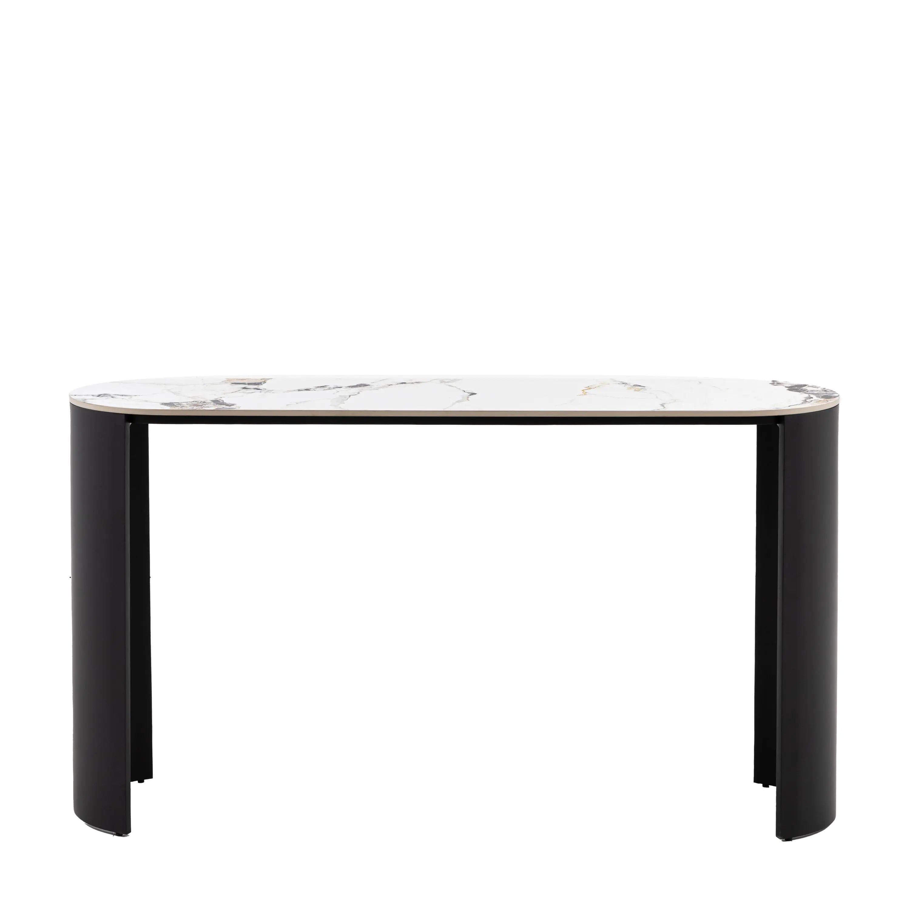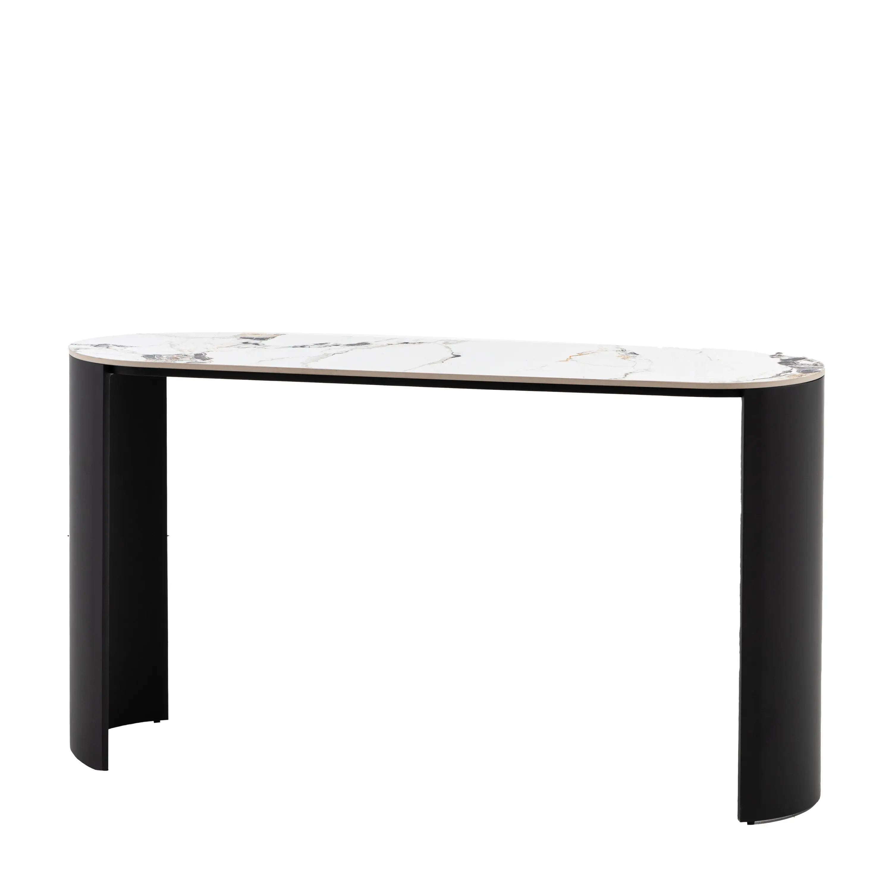 The smooth curves and sophisticated simplicity of this console table will bring elegance to any contemporary interior. The sleek matt black metal legs are paired with a Carrara marble style stone top, combining durability with refined, high end style. Perfect for hallways, living rooms or bedrooms alike, the soft, rounded forms add a sence of fluidity and blend subtle luxury with everyday practicality.