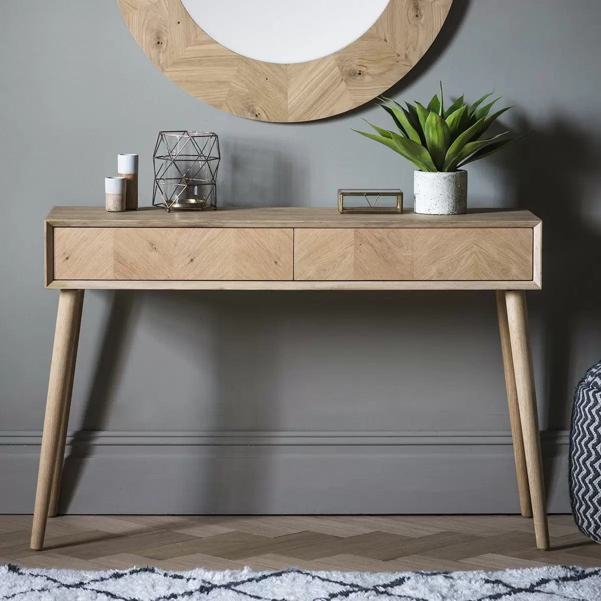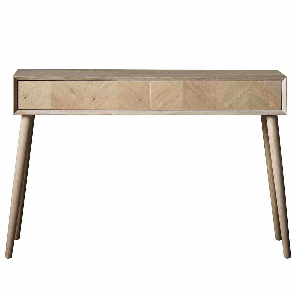 The Diss 2 Drawer Console Table is a must-have for any stylish home. With its stunning inlay chevron design and use of European oak and rustic oak structured veneers, this table showcases the natural beauty of the wood grain and knots. The specialist mat lacquer finish adds a touch of elegance and keeps the timber looking natural and dry. Plus, the brushed out grain gives the table a tactile feel.