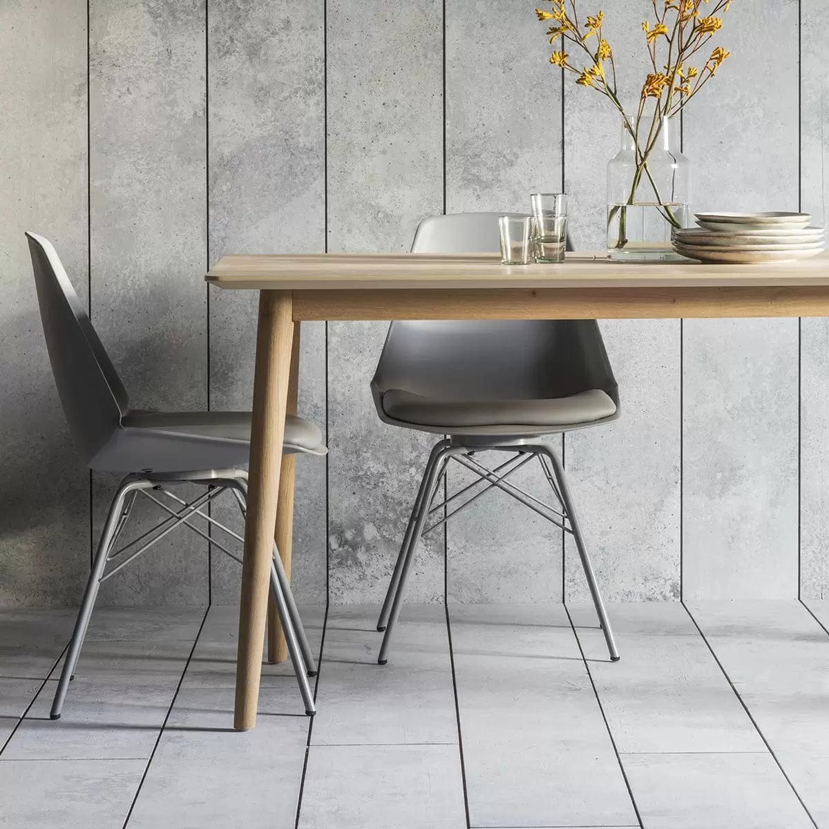 The Diss Dining Table from House of Isabella is a must-have for any stylish dining room. Made with European oak and rustic oak structured veneers, this table showcases the natural beauty of the wood grain and knots. The specialist mat lacquer finish adds a touch of elegance and keeps the timber looking natural and dry. With its inlay chevron design and brushed out grain, this table is not only visually stunning but also tactile to touch.