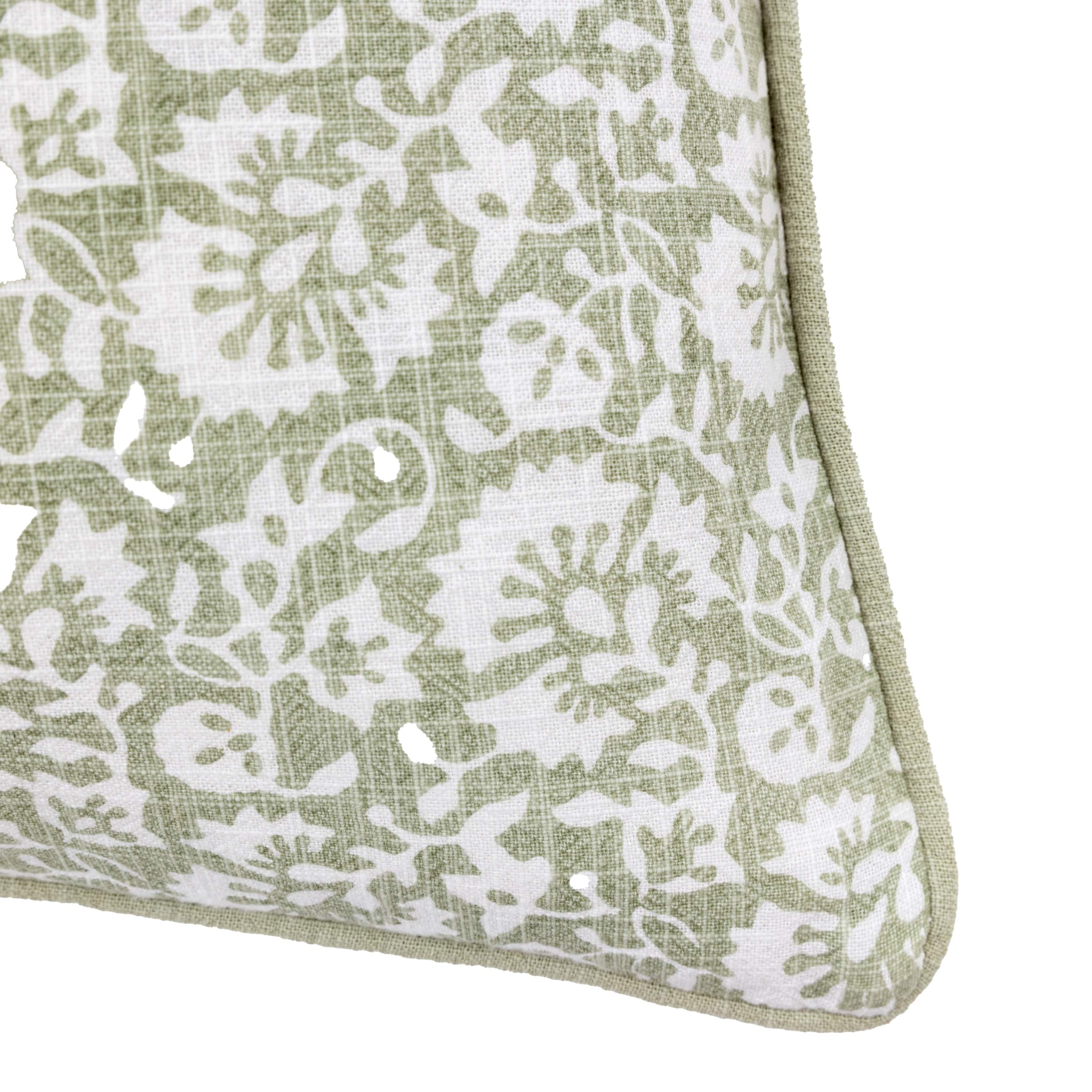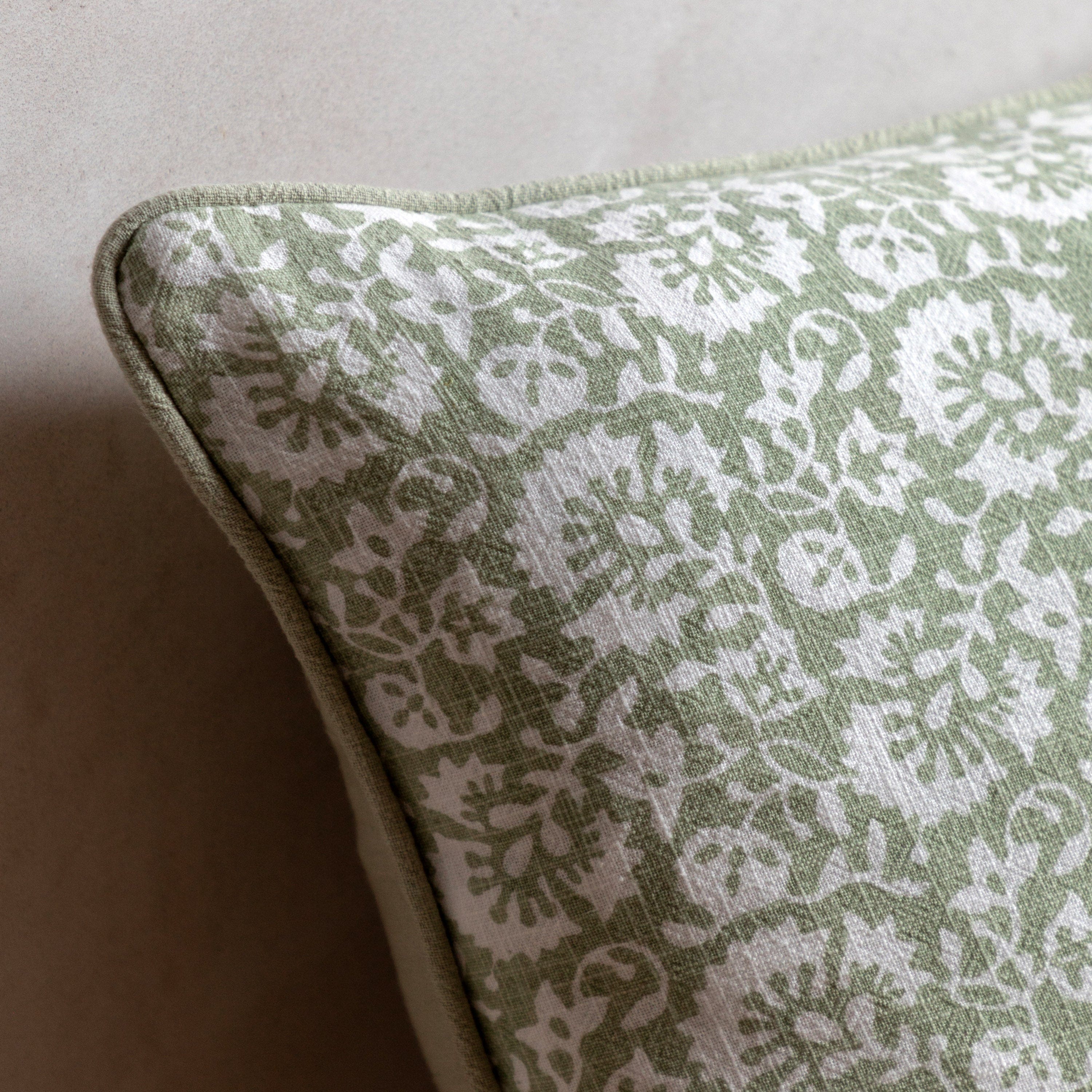 With a soft sage tone, floral print and pipped edging this cushion is an elegant addition to any room.