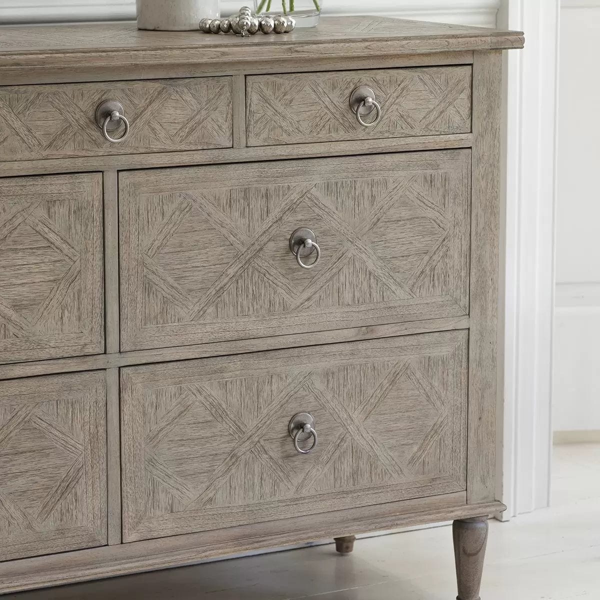 Introducing the Dunbar 7 Drawer Chest from the Mustique collection at House of Isabella. Made from Mindy wood and lightly brushed to mimic the natural aging of a beachside veranda, this chest exudes a timeless charm. With a design and finish inspired by French Colonial style, it is the perfect addition to any modern interior.