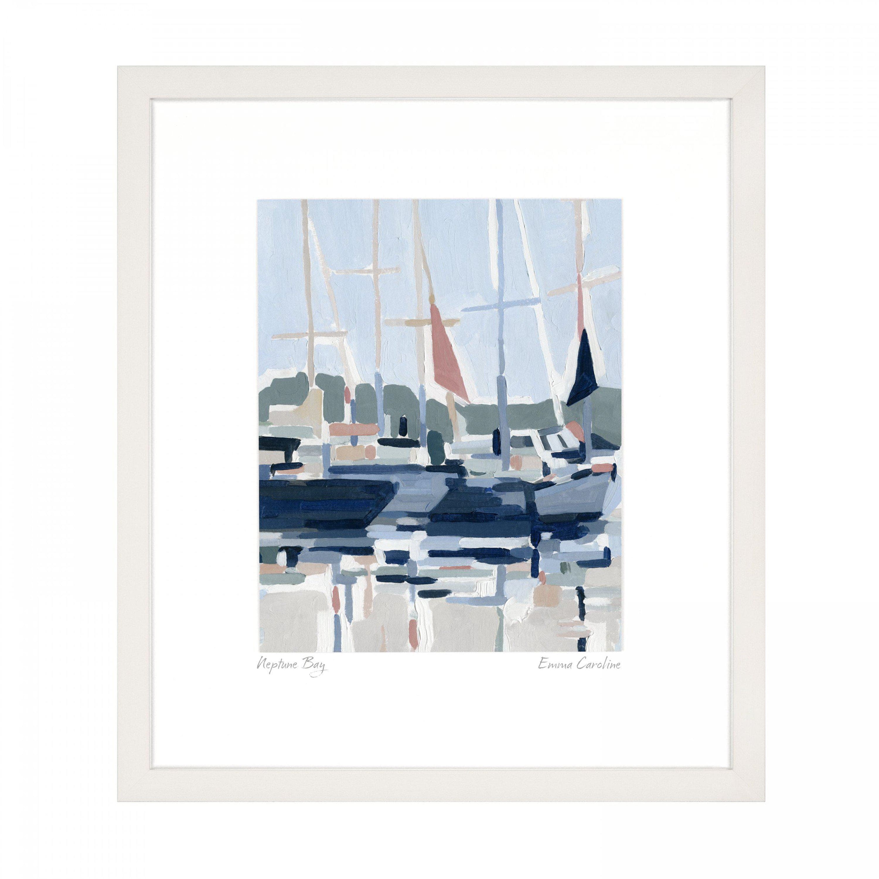 Central to this radiant illustration of moored sailing boats is the striking use of colour. A tight flotilla awaits quietly in anticipation of the voyages ahead. Emma Caroline uses bold brush strokes to convey the magic behind sailing endeavours. Using a white border and pale warm grey frame illuminates the coastal scene that sits neatly behind a glaze.