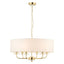 The Nixon 3 light ceiling pendant is finished in a bright nickel plate. The 3 arms are complimented with a touch of crystal and the fitting is topped with a narrow, vintage white, faux silk shades. Height is adjustable, dimmable and suitable for use with LED lamps. Matching items available